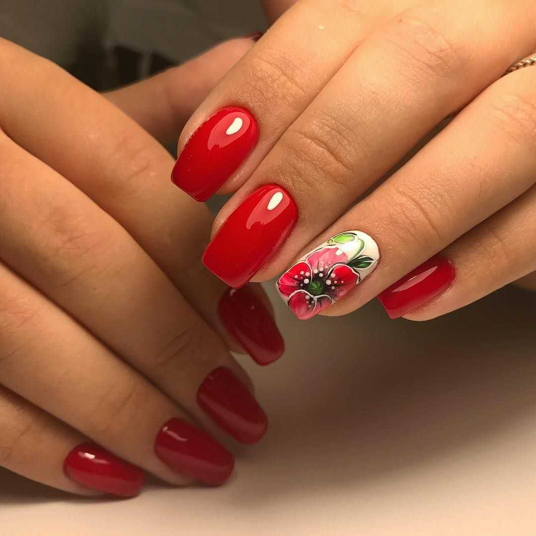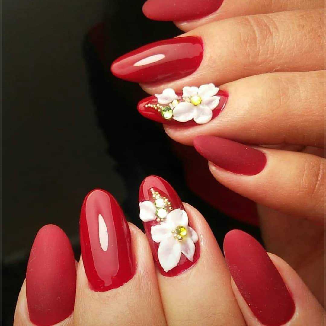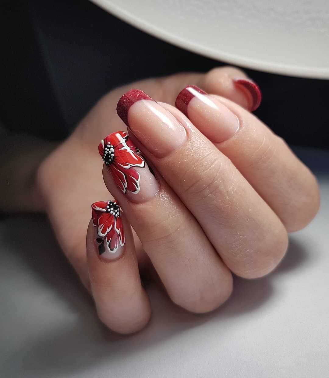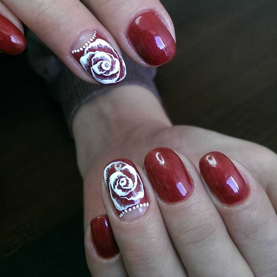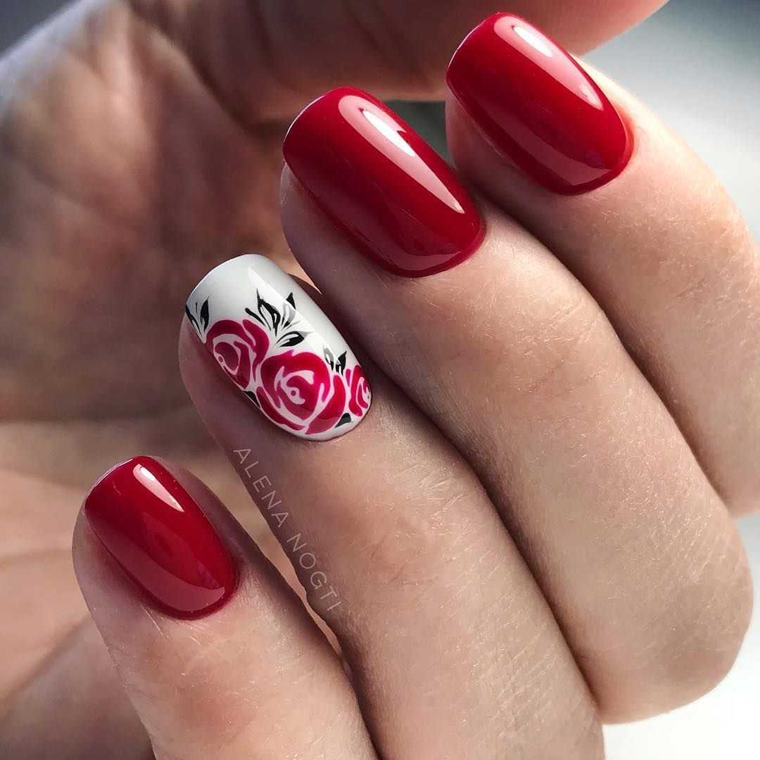 Говоря о флористике имеется ввиду огромное разнообразие цветов, в том числе абстрактных и не существующих, которые можно расположить на бордовом фоне. Самым популярным цветком, который используется с красной и бордовой цветовой палитрой, считается роза. Этот благородный и красивый цветок не только смотрится привлекательно, но и придает своей обладательнице нотки шарма и загадочности. Благодаря объемному рисунку, маникюр получается красивее и ярче. Дизайн можно выполнить художественной росписью, нанести рисунок и посыпать “сахарком”. Для маникюра можно использовать розы в черном, бордовом, белом и других насыщенных оттенках.