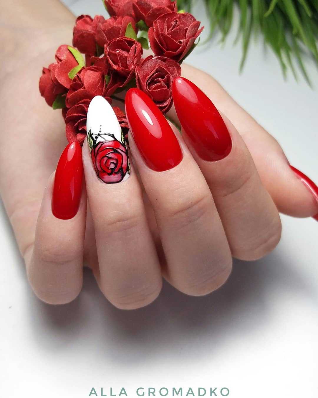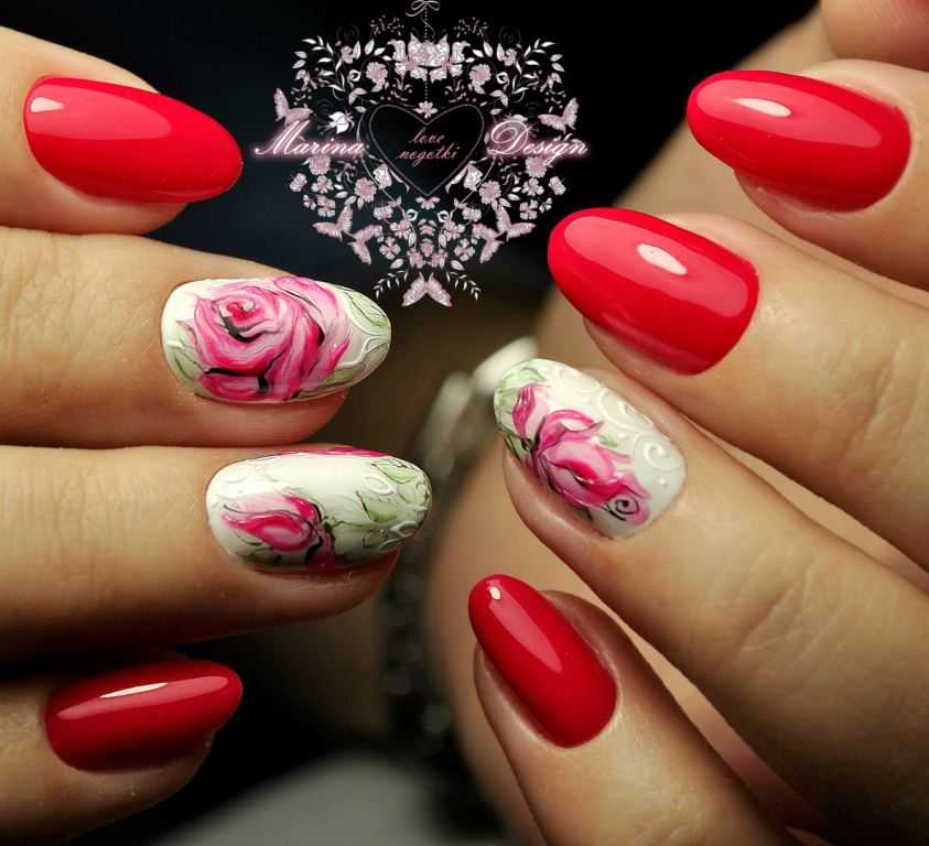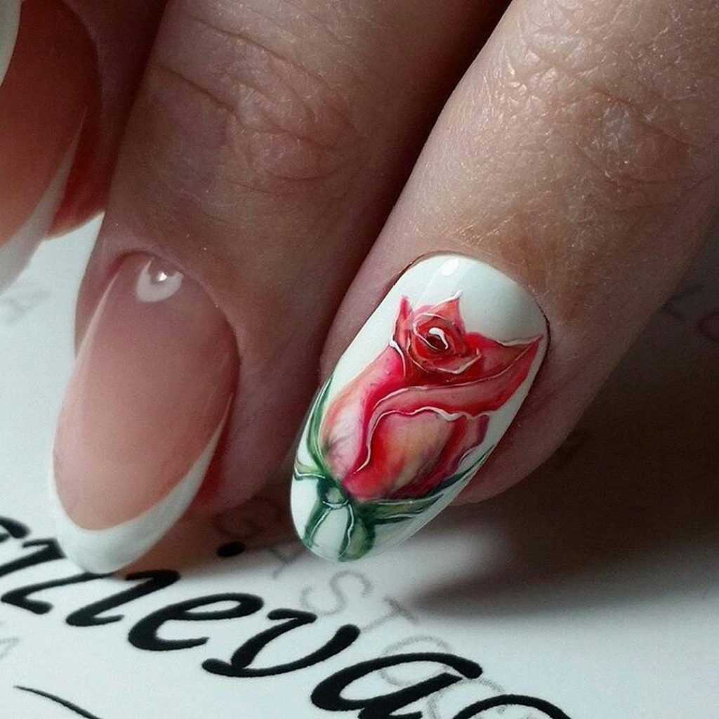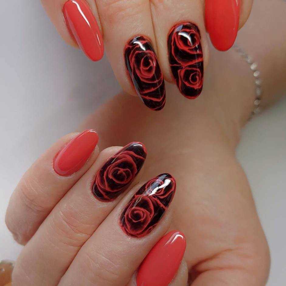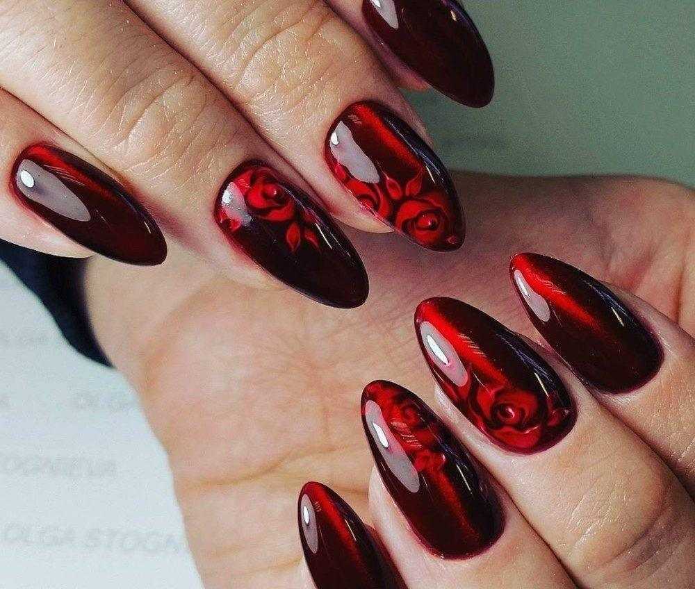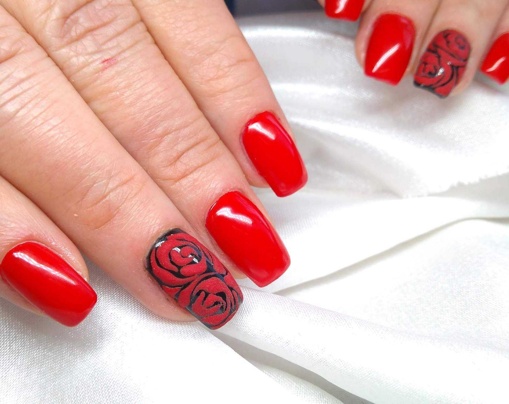Говоря о флористике имеется ввиду огромное разнообразие цветов, в том числе абстрактных и не существующих, которые можно расположить на бордовом фоне. Самым популярным цветком, который используется с красной и бордовой цветовой палитрой, считается роза. Этот благородный и красивый цветок не только смотрится привлекательно, но и придает своей обладательнице нотки шарма и загадочности. Благодаря объемному рисунку, маникюр получается красивее и ярче. Дизайн можно выполнить художественной росписью, нанести рисунок и посыпать “сахарком”. Для маникюра можно использовать розы в черном, бордовом, белом и других насыщенных оттенках.