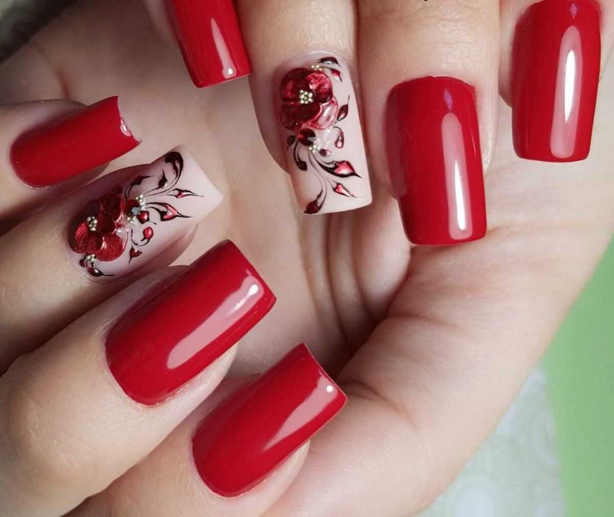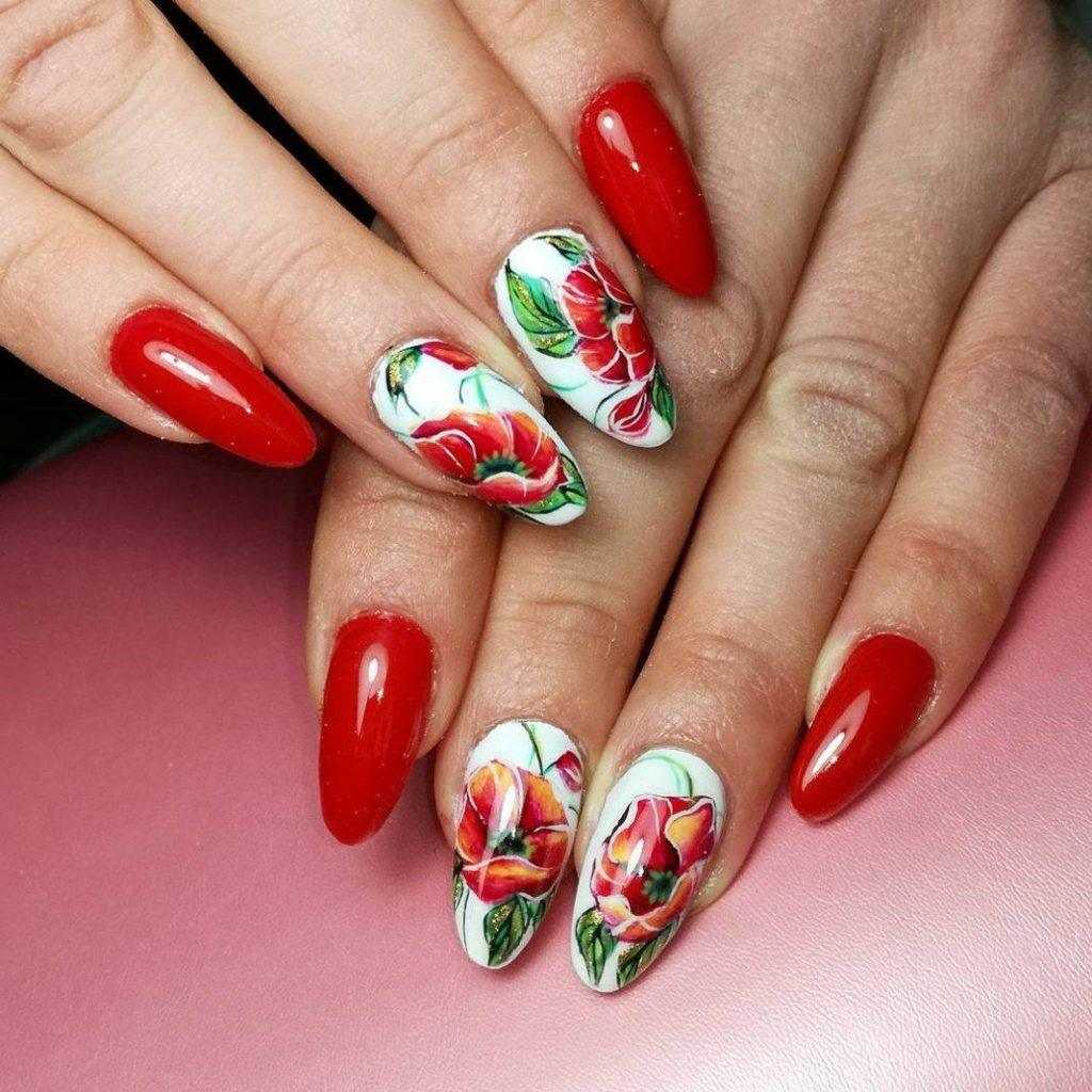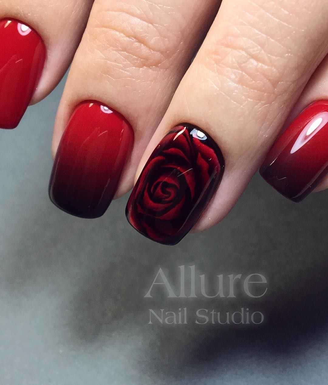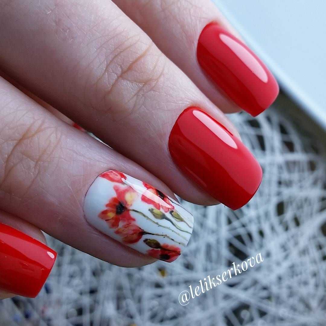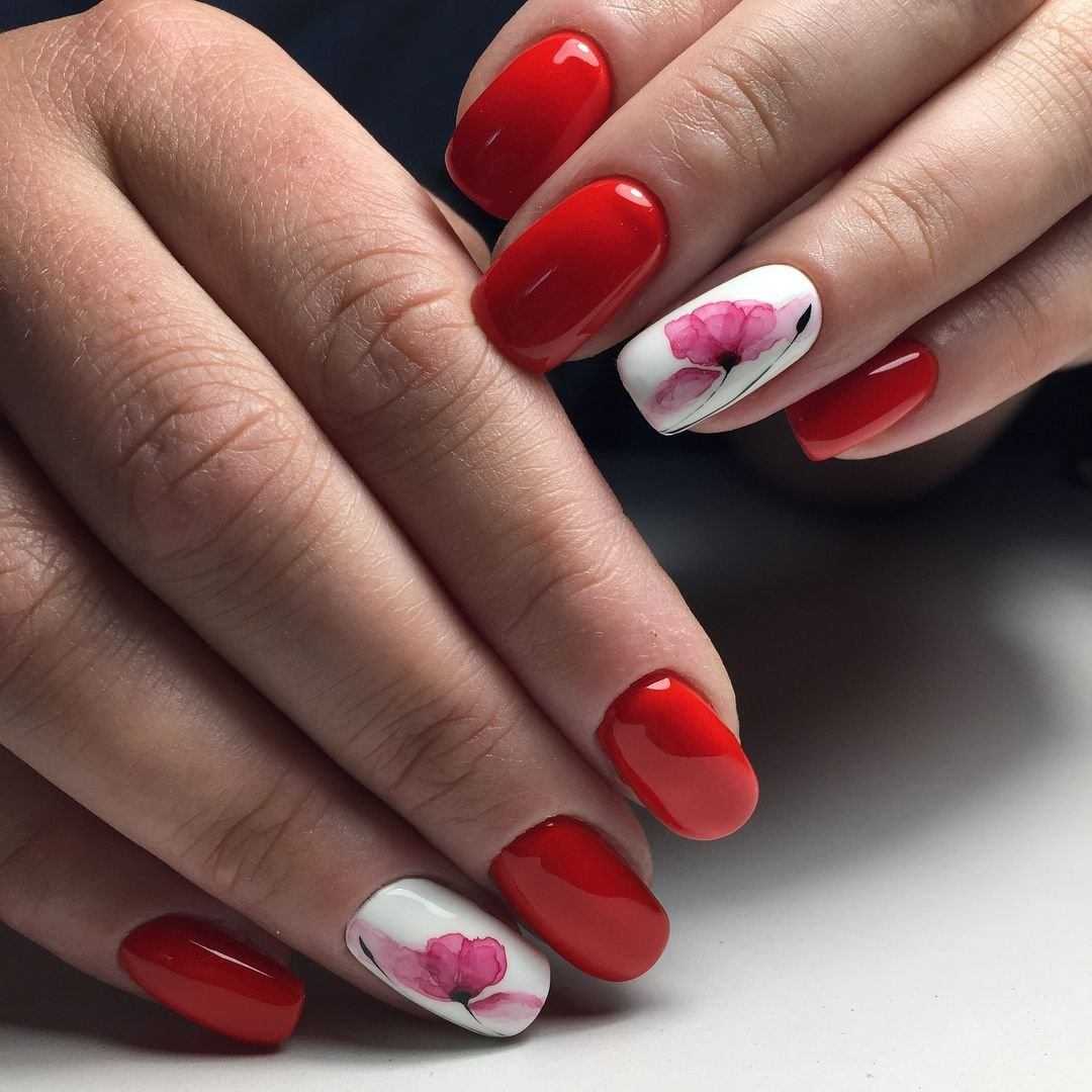 Говоря о флористике имеется ввиду огромное разнообразие цветов, в том числе абстрактных и не существующих, которые можно расположить на бордовом фоне. Самым популярным цветком, который используется с красной и бордовой цветовой палитрой, считается роза. Этот благородный и красивый цветок не только смотрится привлекательно, но и придает своей обладательнице нотки шарма и загадочности. Благодаря объемному рисунку, маникюр получается красивее и ярче. Дизайн можно выполнить художественной росписью, нанести рисунок и посыпать “сахарком”. Для маникюра можно использовать розы в черном, бордовом, белом и других насыщенных оттенках.