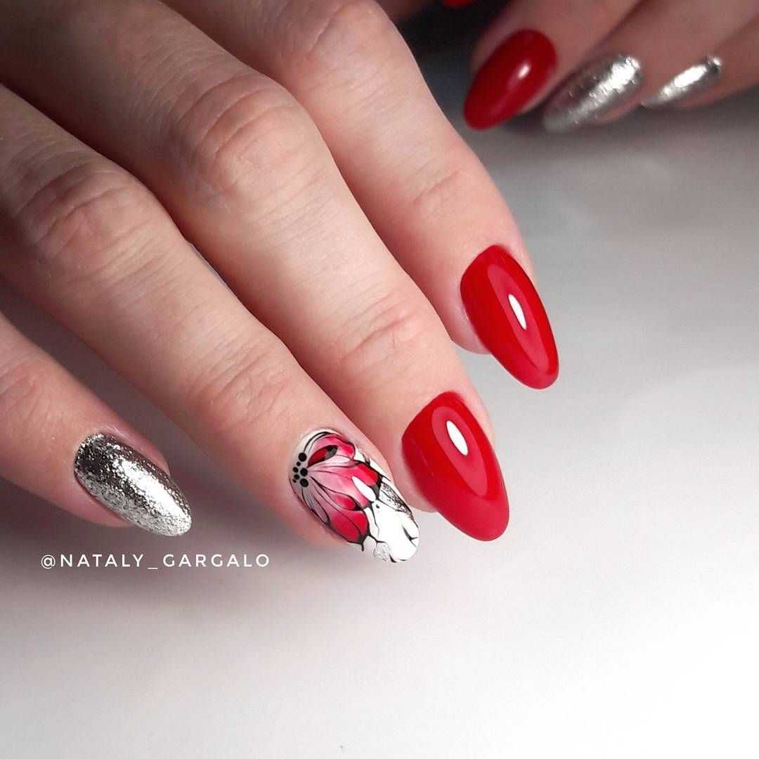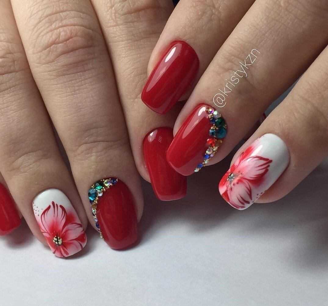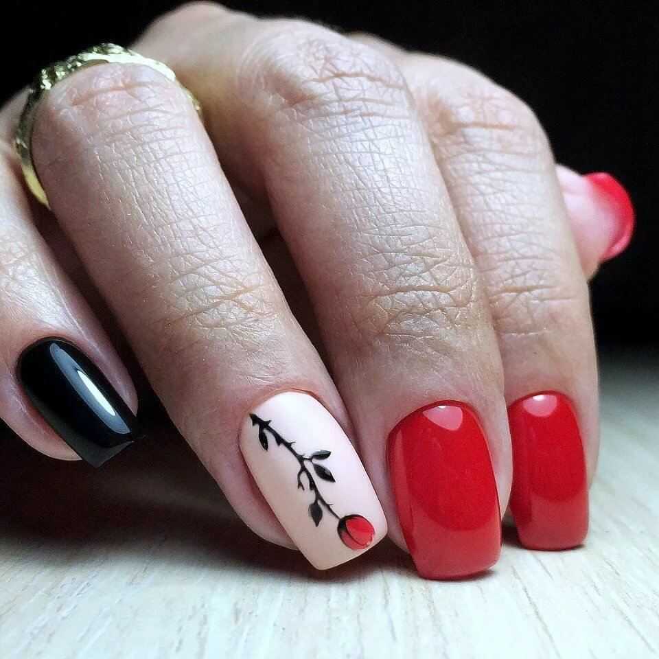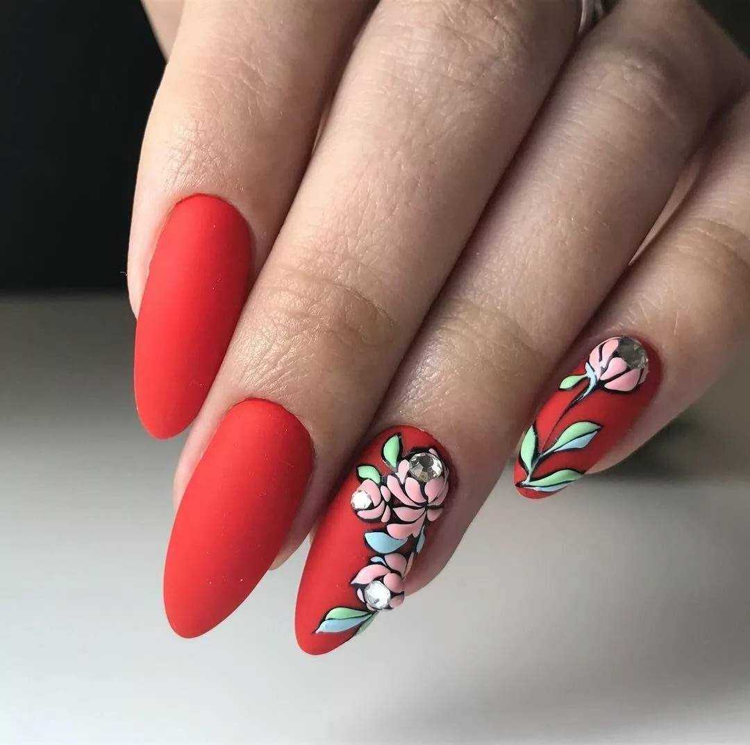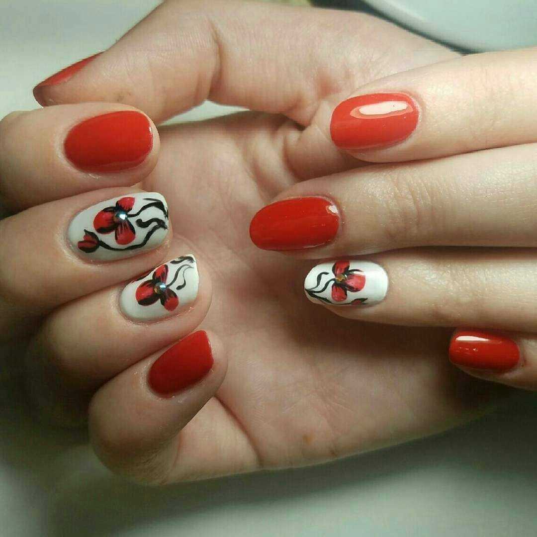 Говоря о флористике имеется ввиду огромное разнообразие цветов, в том числе абстрактных и не существующих, которые можно расположить на бордовом фоне. Самым популярным цветком, который используется с красной и бордовой цветовой палитрой, считается роза. Этот благородный и красивый цветок не только смотрится привлекательно, но и придает своей обладательнице нотки шарма и загадочности. Благодаря объемному рисунку, маникюр получается красивее и ярче. Дизайн можно выполнить художественной росписью, нанести рисунок и посыпать “сахарком”. Для маникюра можно использовать розы в черном, бордовом, белом и других насыщенных оттенках.