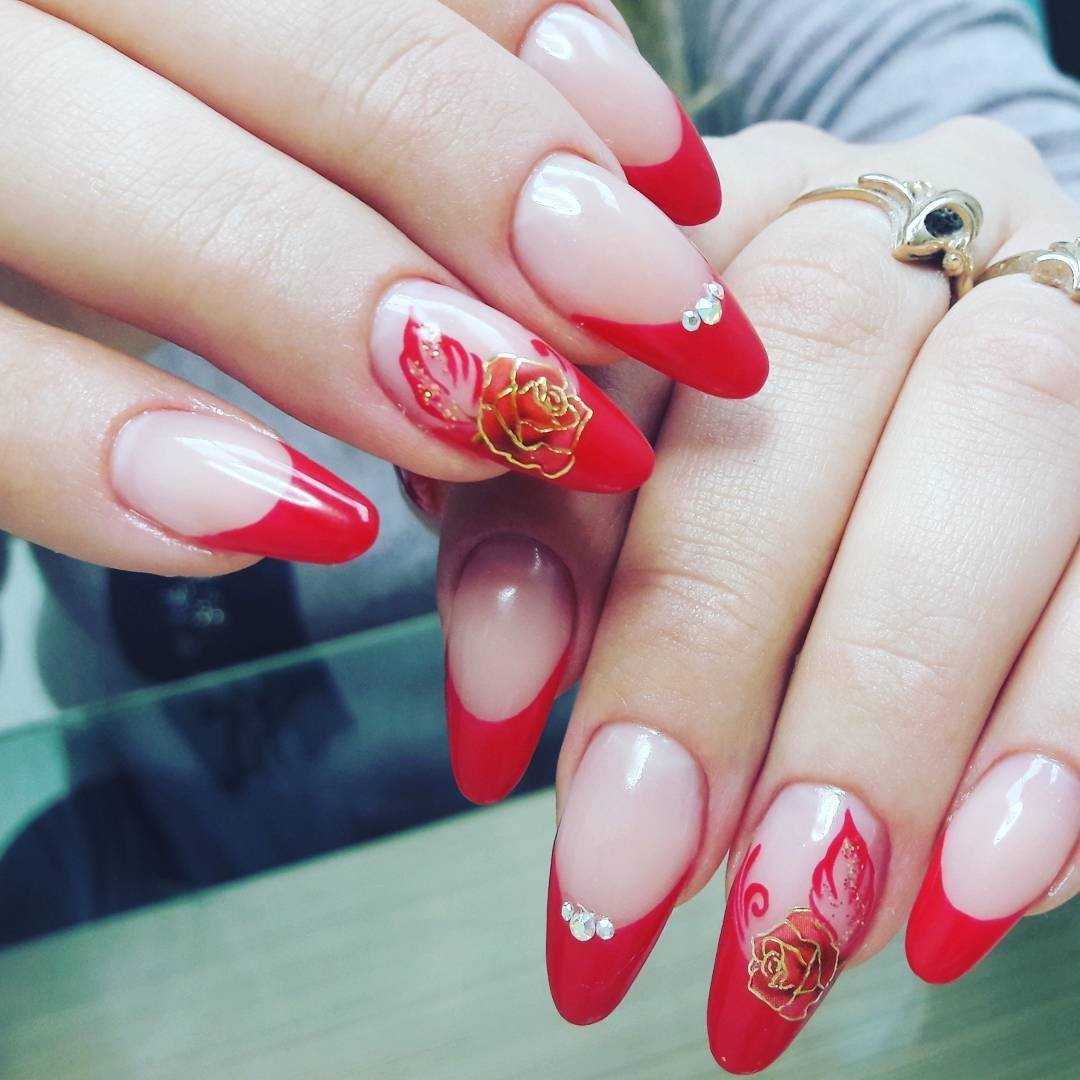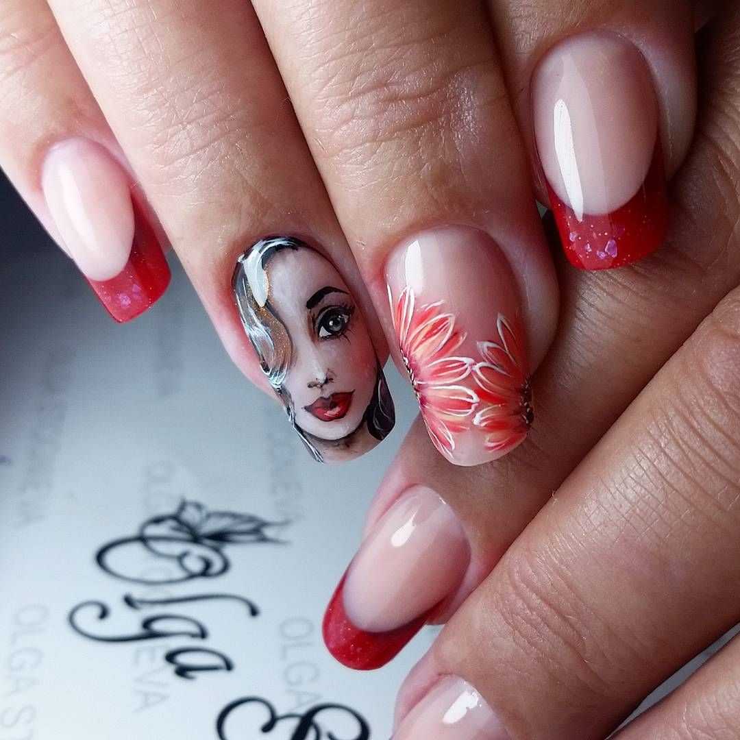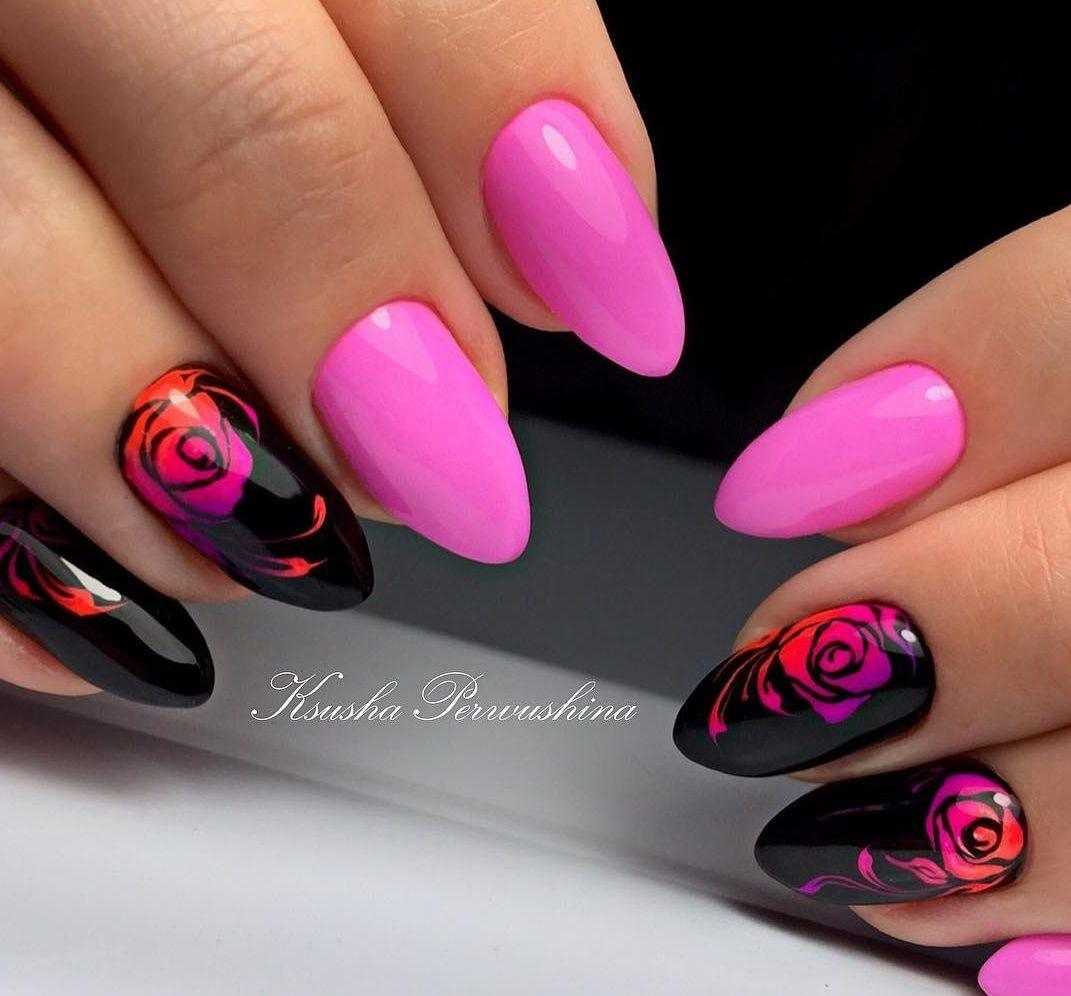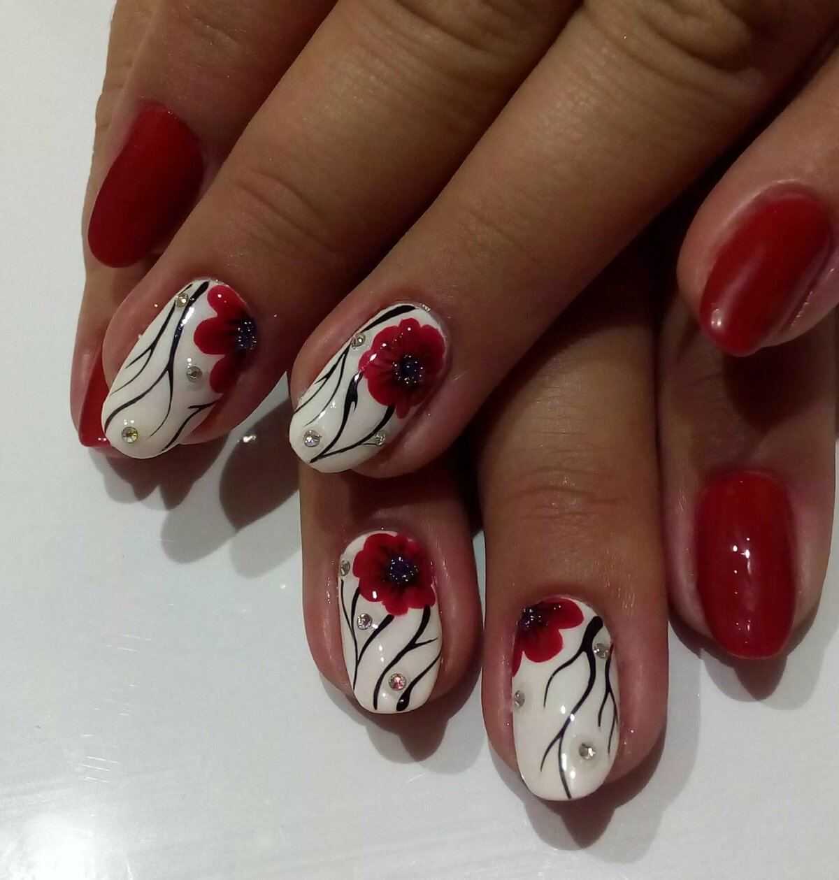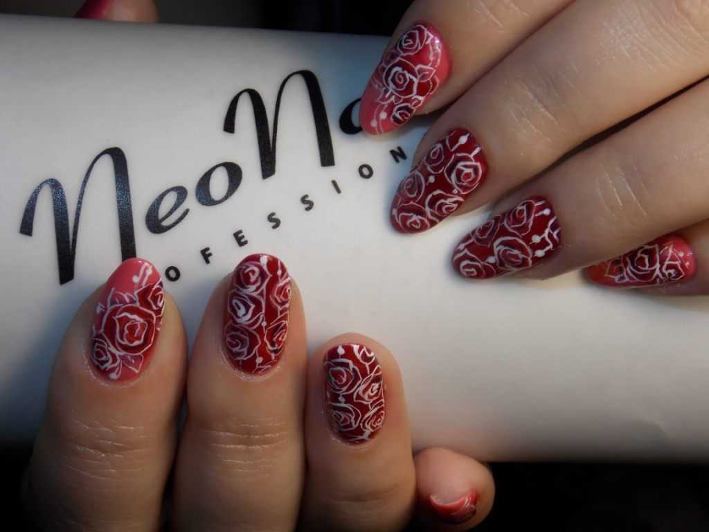 Говоря о флористике имеется ввиду огромное разнообразие цветов, в том числе абстрактных и не существующих, которые можно расположить на бордовом фоне. Самым популярным цветком, который используется с красной и бордовой цветовой палитрой, считается роза. Этот благородный и красивый цветок не только смотрится привлекательно, но и придает своей обладательнице нотки шарма и загадочности. Благодаря объемному рисунку, маникюр получается красивее и ярче. Дизайн можно выполнить художественной росписью, нанести рисунок и посыпать “сахарком”. Для маникюра можно использовать розы в черном, бордовом, белом и других насыщенных оттенках.