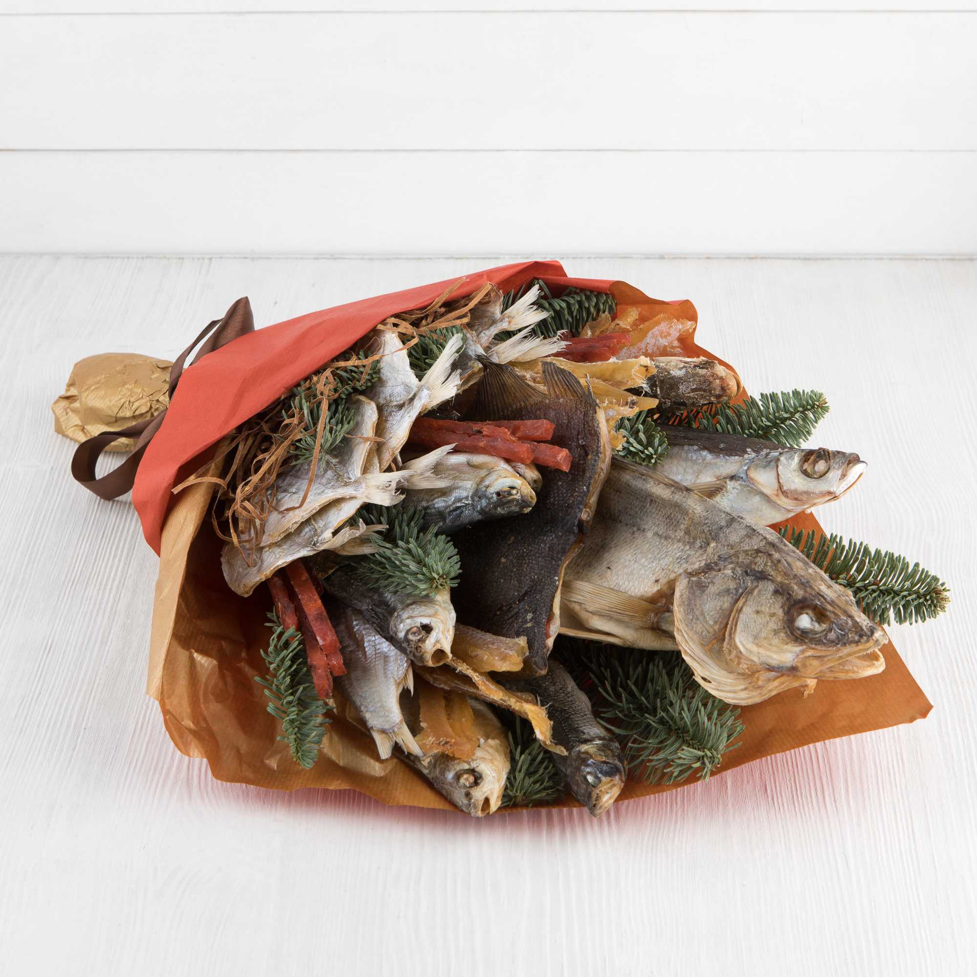Кто сказал, что в букете должны быть рыбины одного сорта? Как и в цветочной композиции, здесь допускается абсолютно любое сортовое сочетание. Щука, язь, красноперка, вомер, лещ, вобла, и даже плоская и объемная камбала сгодятся в качестве вкусного подарка. Прежде всего, вспомните о любимых предпочтениях именинника, любит ли он (она) тарань или рыбу горячего/холодного копчения. Таранка будет придавать букету легкость, впрочем, таким угощением всегда можно поделиться.