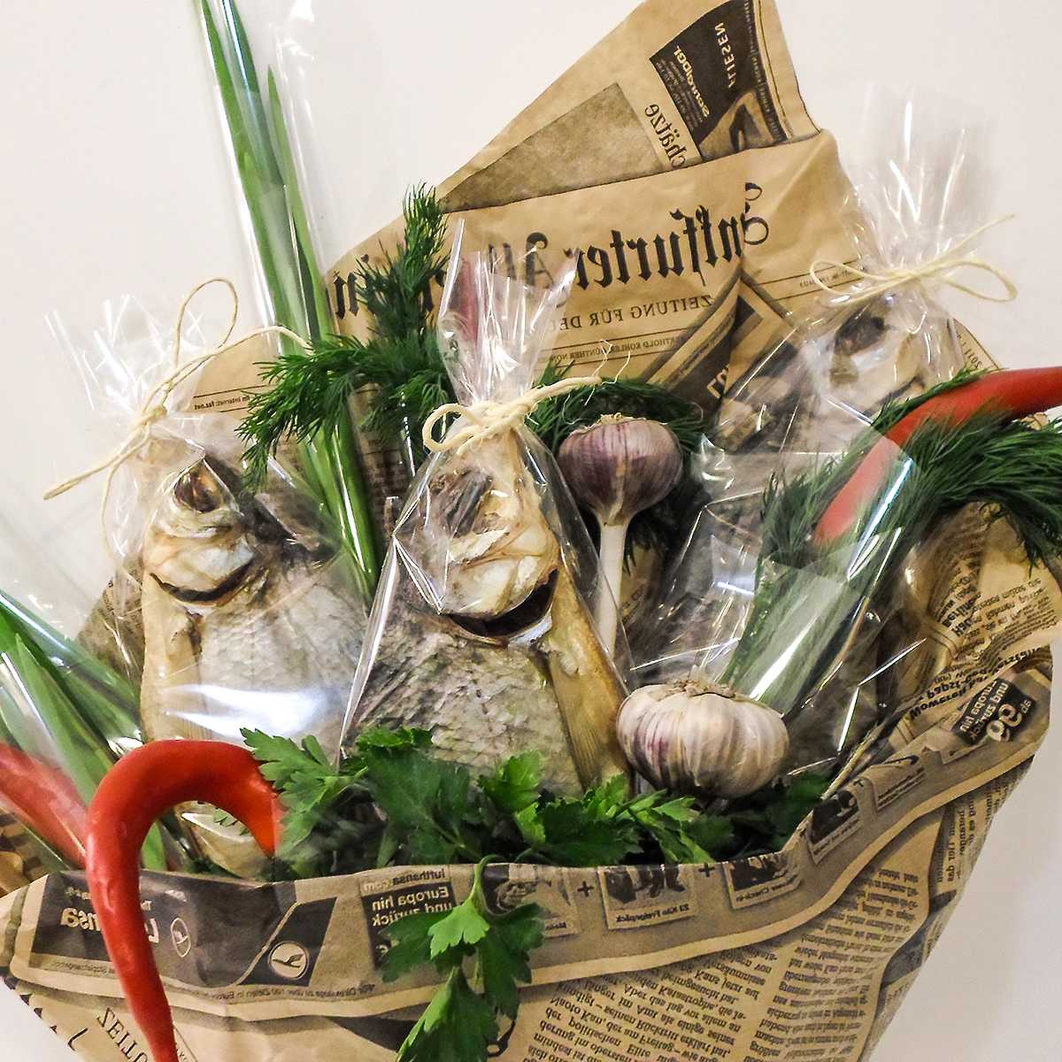 Букет из рыбы будет смотреться не менее гармоничным в окружении овощей. К примеру, дополнить рыбный сбор можно перцем, чесноком, сельдереем, а главным акцентом станет зелень. Душистая петрушка, укроп, лук или кинза ничуть не испортят рыбу. Однако, рыбные деликатесы в вяленом виде порой выглядят не совсем презентабельно, особенно это касается рыбной головы. Скрыть этот изъян рекомендуется с помощью прозрачной обертки. Каждую рыбку заворачиваем в пакет-конфетку и завязываем бичевой веревкой.