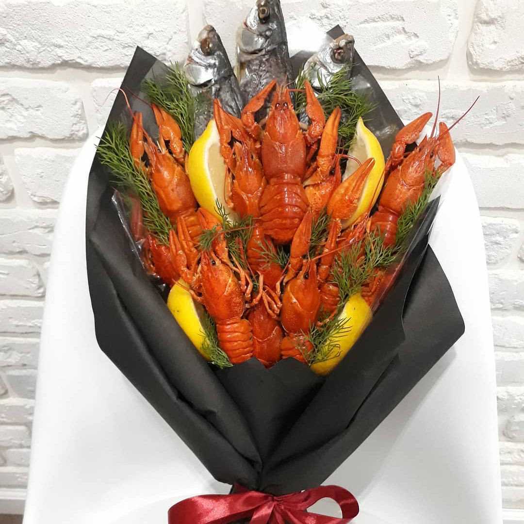 Вареные раки и таранка — мечта любого пивного гурмана. Для полноты композиции не хватает лишь пивной кеги. Букет, удобренный лимонами и зеленью, впишется в застолье выходного дня или подходящего праздника. Готовить его необходимо непосредственно в день вручения, т.к. нежное мясо раков быстро портится.