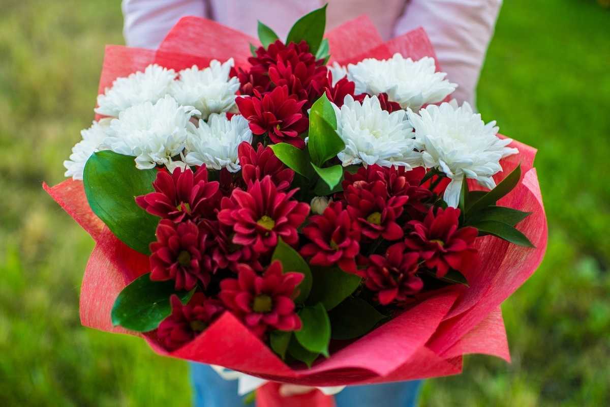Букет из красных и белых хризантем в алой упаковке из нескольких слов;