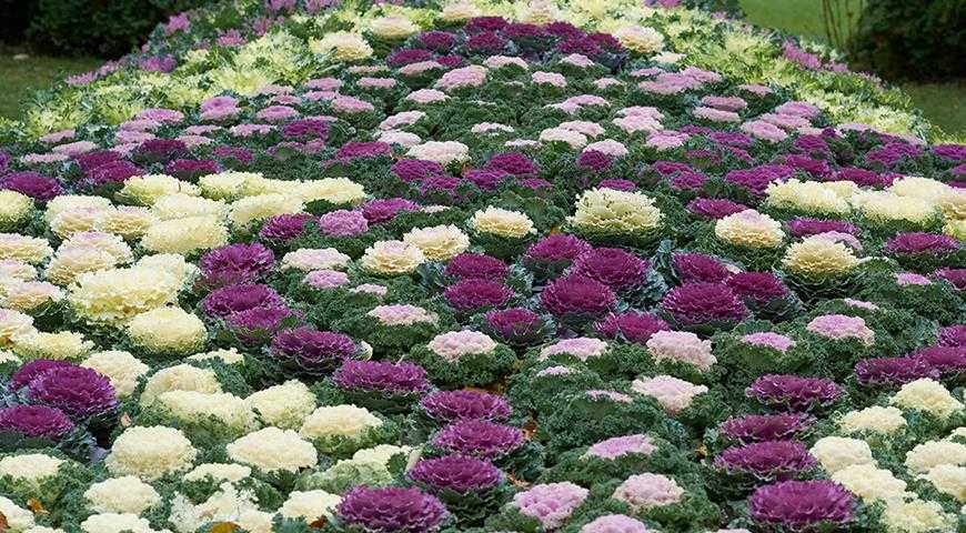 Декоративная капуста потрясающе смотрится при посадках большими массивами. Но так как период ее декоративности — сентябрь-декабрь, то такие массивы чаще всего высаживают в больших парках. А на обычных дачных участках ее используют как элемент обычных цветников.