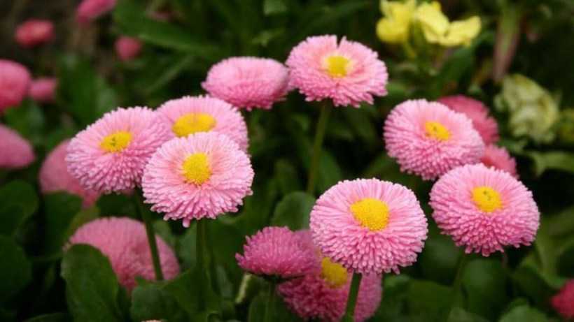 - Белла Дэйзи — очень колоритные и небольшие цветы ярко-розового цвета. Соцветия очень объемные и пушистые, что очень ценится у садоводов.