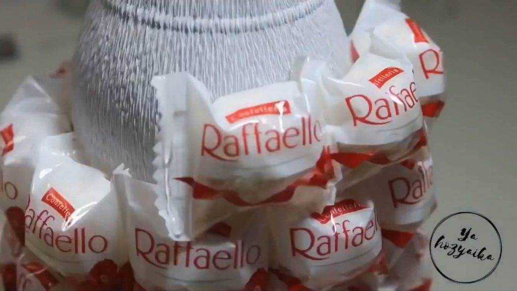 Простой и в то же время интересный вариант украшения – декор бутылок к празднику 8 марта своими руками конфетами Рафаэлло.