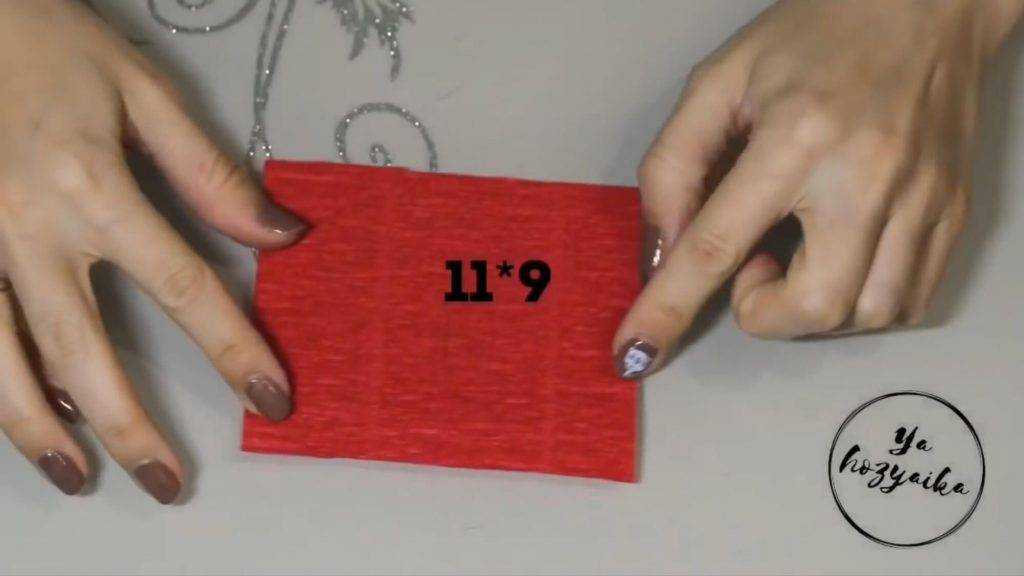Затем берём красную гофрированную бумагу и вырезаем прямоугольник 11/9 см. Склеиваем его 9-ти сантиметровые боковые стороны. Это будет чехол для горлышка бутылки.
