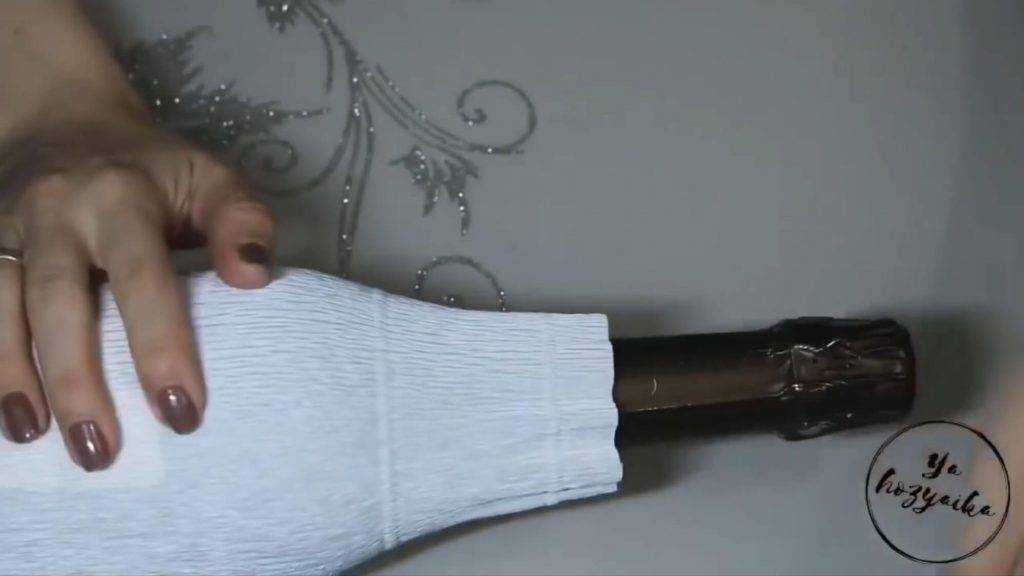 3. Далее края бумаги вам нужно загнуть к вершине конфеты. Начните приклеивать конфеты к бутылке с помощью клея.
