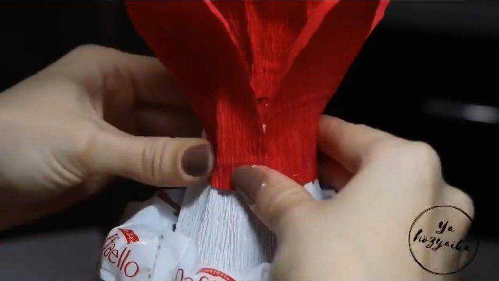 На видео – оформление бутылки шампанского конфетами к дню 8 марта: