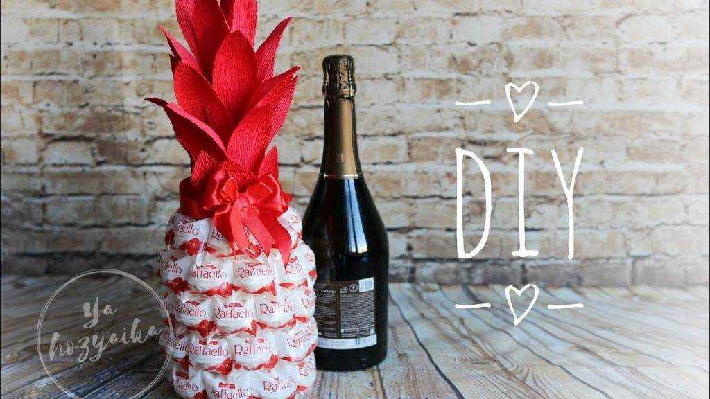 - ананас. Если «торт» и «букет» являются классическими вариантами декорирования, то «ананас» относится к более смелым и оригинальным видам дизайна. Этот способ отделки превращает бутылку, украшенную конфетами, в своеобразный «киндер-сюрприз». Под слоем сладостей совершенно не видно основы, и о тайном содержимом «ананаса» можно узнать, лишь взяв его в руки. Для этого вида декорирования выбирают круглые конфеты в золотистой либо желтой упаковке. Если цвет фантика любимых сладостей не соответствует канону, их можно дополнительно обвернуть в упаковочную бумагу нужного оттенка. Гладкое стекло и глянцевый фантик не всегда хорошо склеиваются между собой. Чтобы шампанское в конфетах было спрятано надежно, алкоголь нужно предварительно обклеить слоем гофробумаги. А уже на бумажную основу крепить сладости. Горлышко бутылки скрывают под зелеными бумажными «листьями». Если стык вышел не слишком аккуратным, его можно закрыть оригинальной тесьмой, кружевом или лентой.