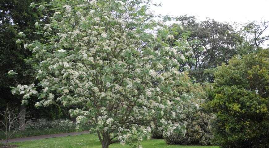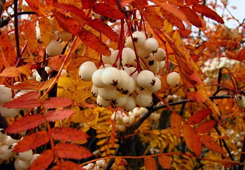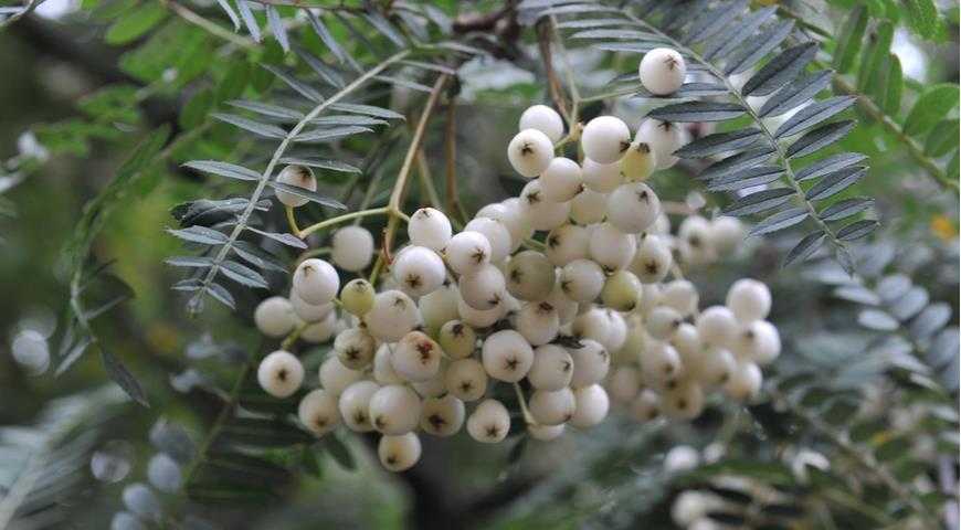 и белыми или кремовыми ягодами осенью. Листья рябины кашемировидной приобретают желто-золотистый