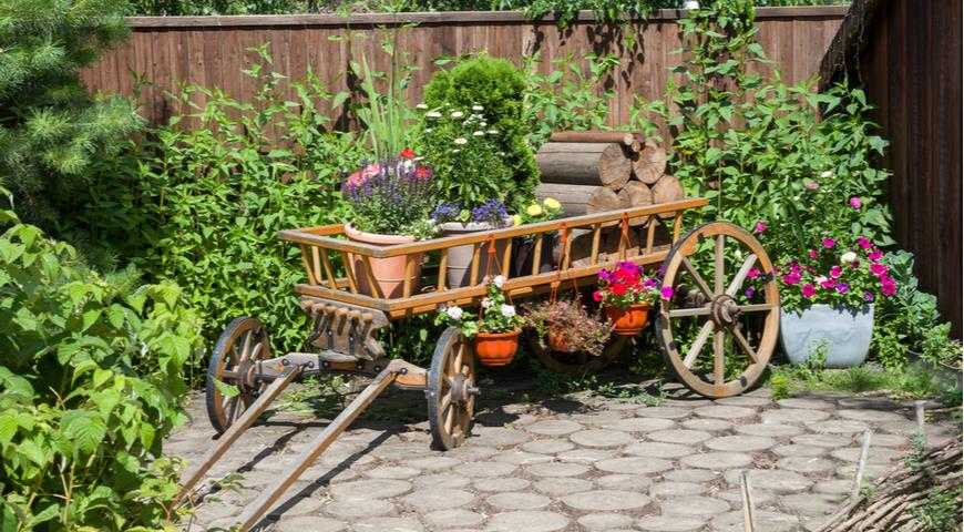 Деревянная тележка, столь практичная на открытом воздухе, очень популярный якорь многих садовых декораций.
