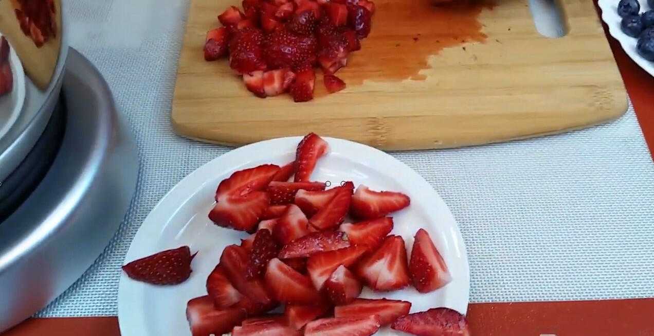 Для начинки я беру свежие ягоды: клубнику, нарезанную на кубики, и голубику. Клубнику, которая пойдет в украшение, нарезаем вдоль на несколько ломтиков.