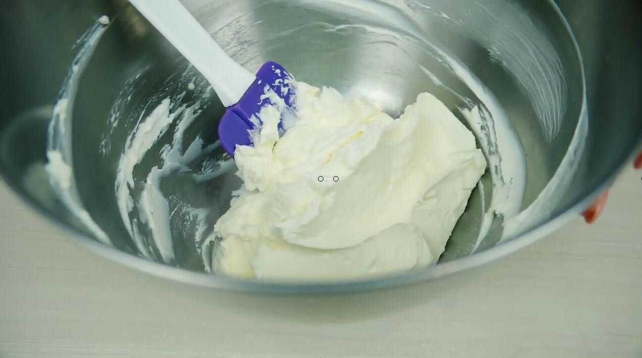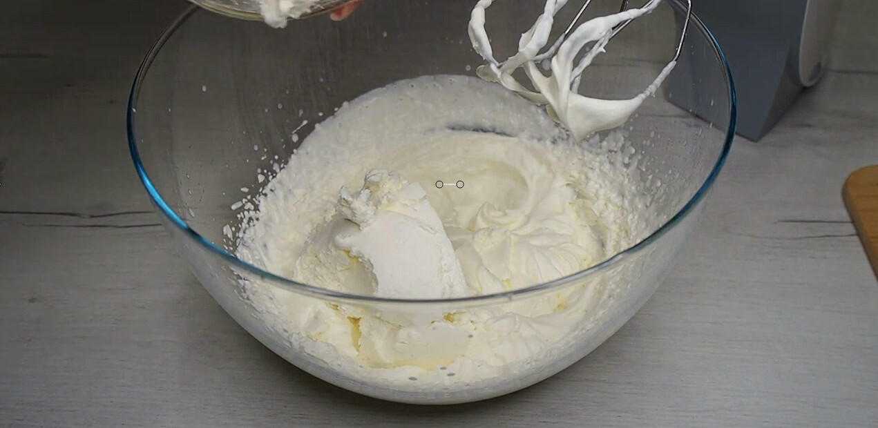 Затем добавляем творожный сыр и на средних оборотах мешаем еще 1 минуту. Творожная масса должна получиться густой и устойчивой. Перекладываем в кондитерский мешок.