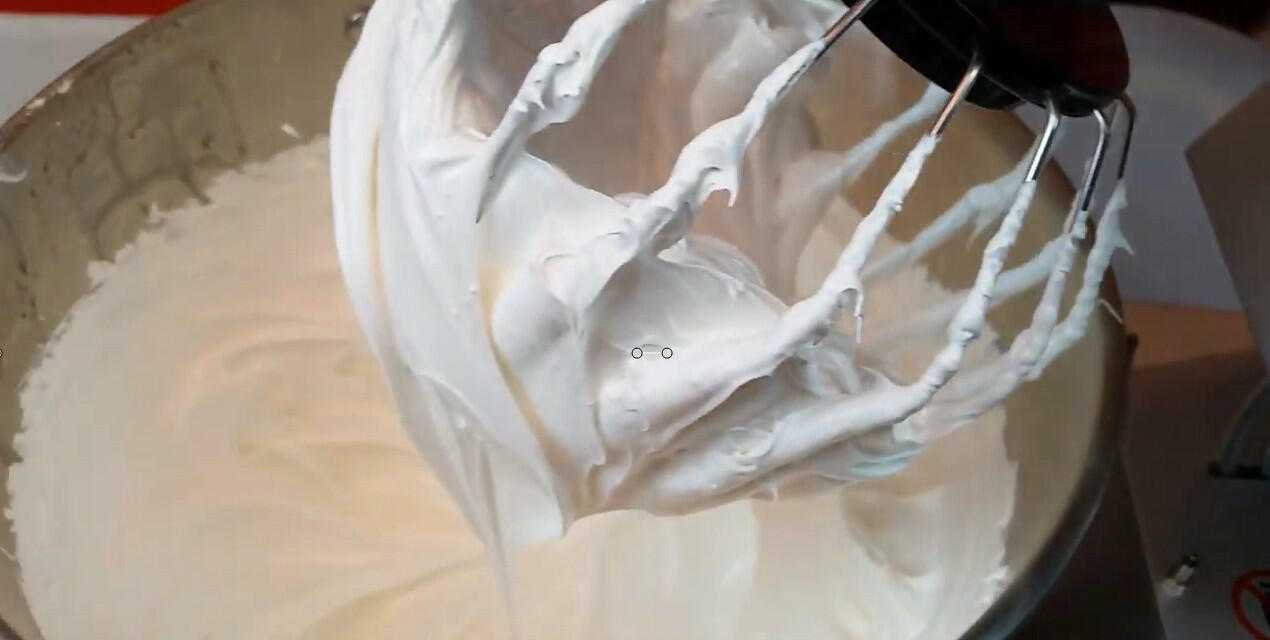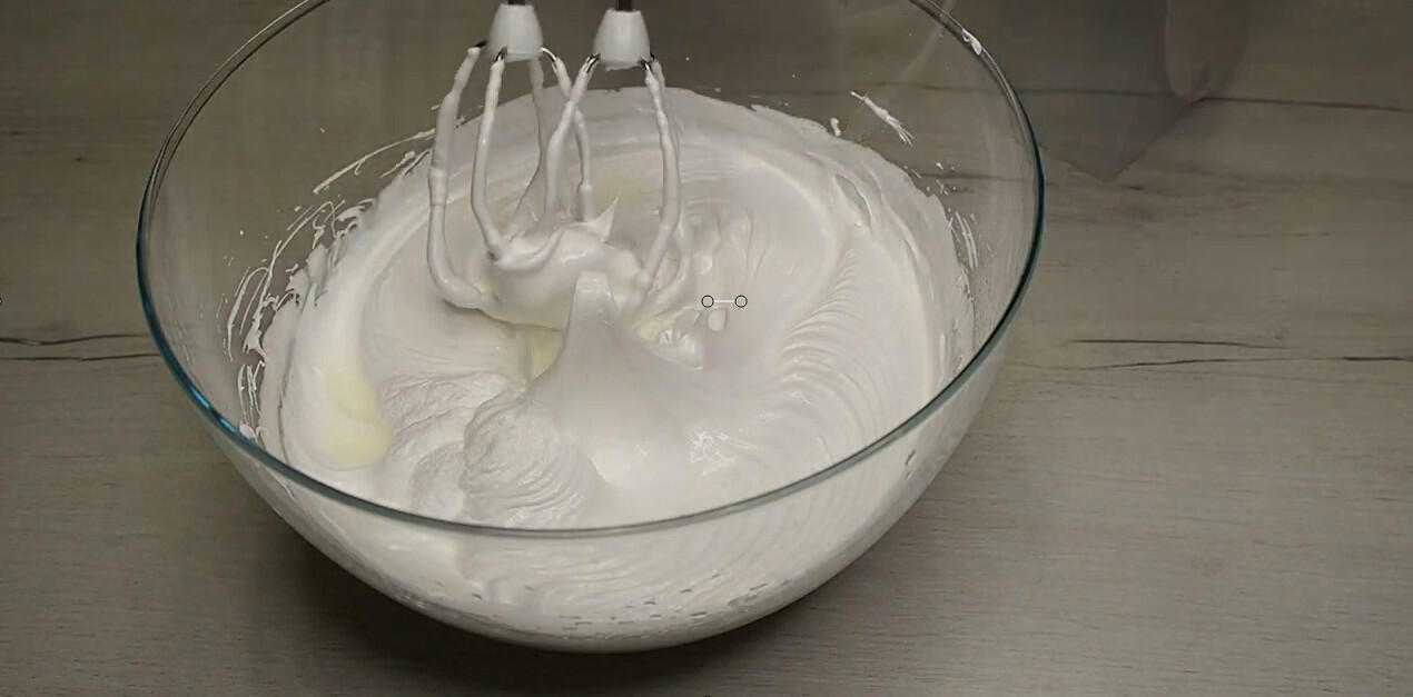 Далее взбиваем миксером до образования устойчивой белоснежной массы, легко держащей форму.