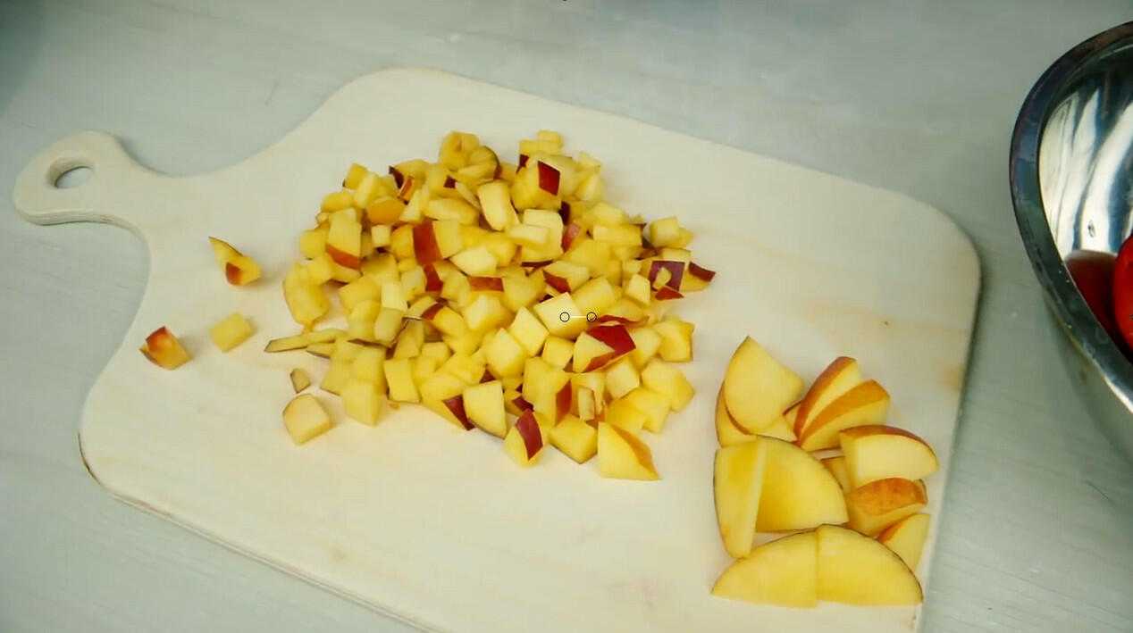 Для начинки я возьму персики. Нарезаем их небольшими кубиками, а для украшения пирожных ломтики пригодятся чуть побольше.