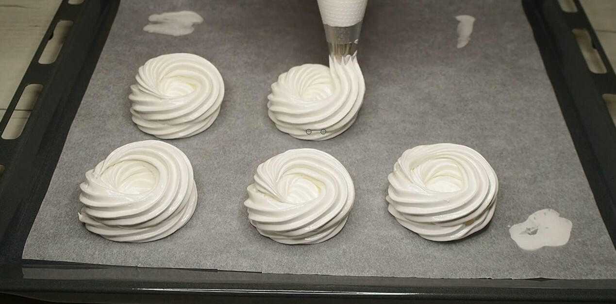 На противень застилаем пергамент и формируем гнездышки с закрытым дном и углублением из меренги (диаметр около 6-7 см, но при выпекании чуть увеличатся).