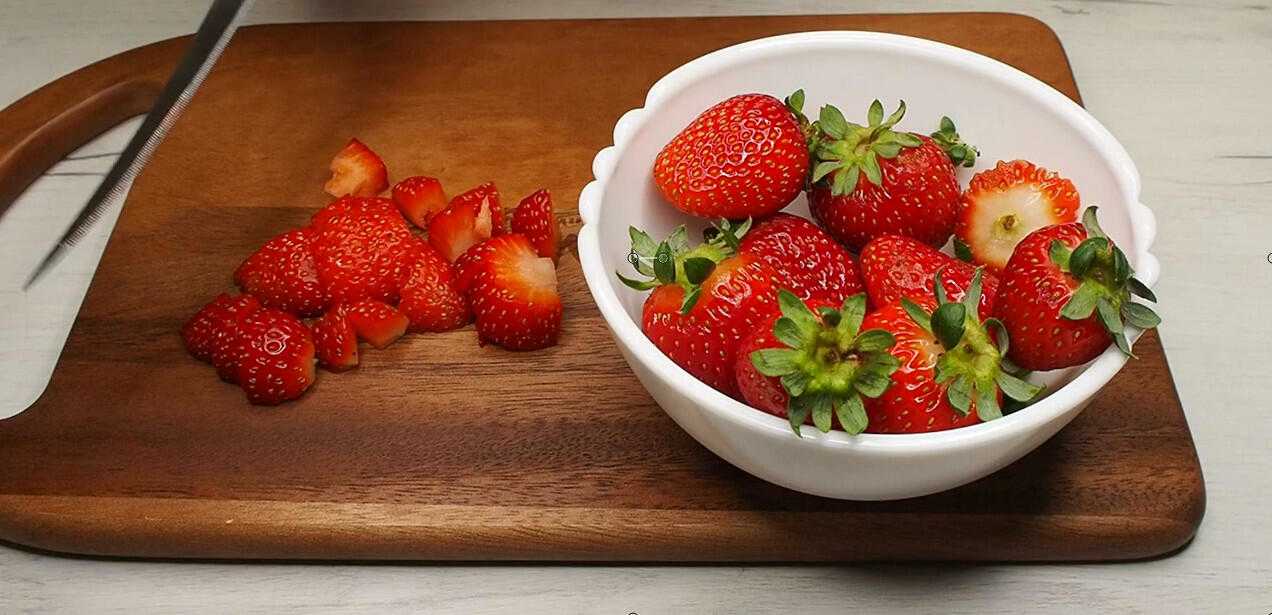 Ягоды промываем и нарезаем на небольшие кубики, предварительно отрезав у клубники хвостики.