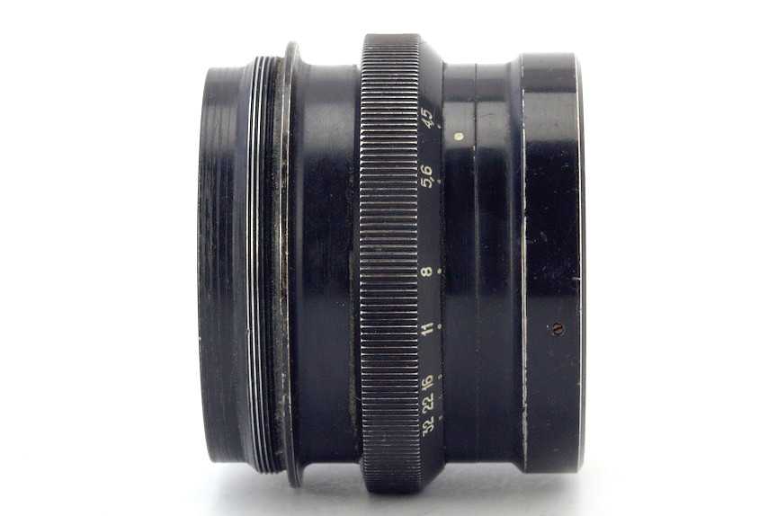 Значения диафрагмы размечены следующим образом: 4.5, 5.6, 8, 11, 16, 22, 32. Объектив на обзор достался с геликоидом, имеющим большой шаг резьбы кольца фокусировки. Геликоид с резьбовым соединением M39 (LSM) для зеркальных или дальномерных камер с одной стороны, и с резьбой M60x0,75 с другой стороны. И-51 через такой геликоид встанет и на зеркалку, и дальномерку благодаря огромному заднему отрезку.