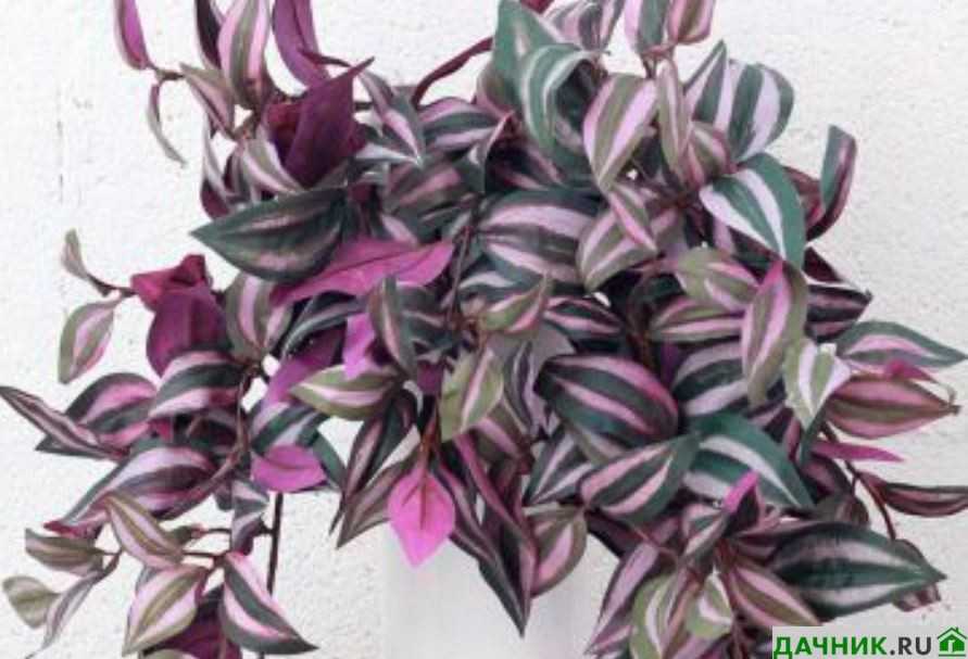 Традесканция бледная Эффектный и неприхотливый к условиям содержания кустик. Подойдёт начинающим цветоводам. Многие традесканцию выращивают как ампельную культуру. Вазон обязательно размещают в таком месте, где будет яркое, но рассеянное освещение. Свет влияет на яркость и насыщенность листвы с пурпурными расцветками. Традесканция бледная – это ещё один представитель цветущих культур, комнатный цветок с фиолетовыми листьями.