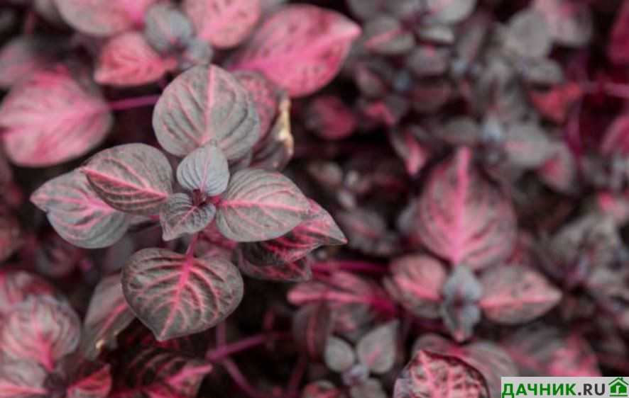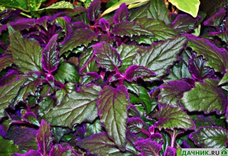 Гемиграфис В отличие от эффектной листвы, цветочки не интересны — они маленькие, невзрачного вида. На солнце листья насыщенных тёмно-пурпурных тонов, а в тени приобретают серебристый отлив. Нежный гемиграфис нуждается в трепетном уходе и подходящем микроклимате, ведь его родная среда обитания — влажные тропики.