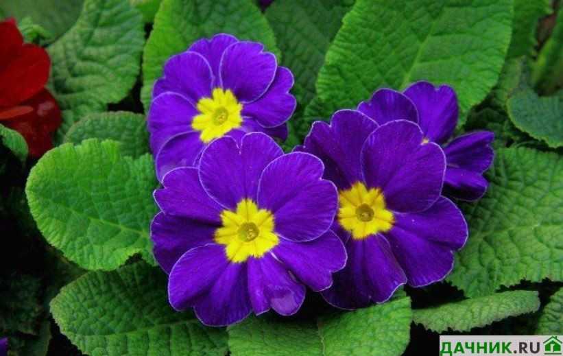 Примула Очаровательный куст радует цветением уже в марте. Листья собираются в плотную розетку, и над ней раскрывается зонтик с бутонами, окрашенные в разные оттенки фиолета.