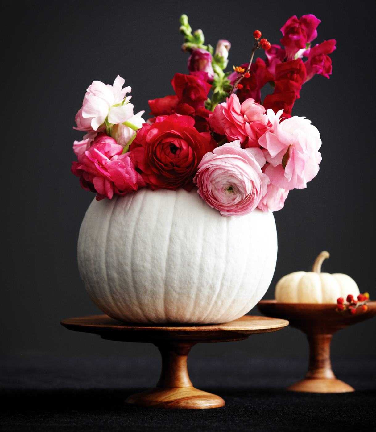 3. Подготовьте цветы, осенние листья, ветки рябины. Для этого обрежьте стебли таким образом, чтобы они помещались в полость сосуда и были чуть выше, чем глубина тыквы.
