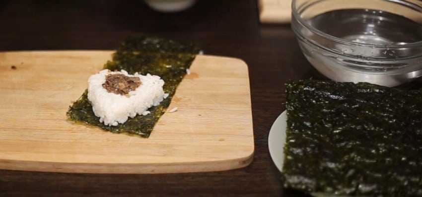 7. Смочите руки и оберните рисовый треугольник в лист нори.