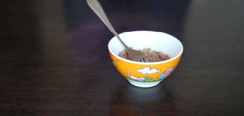 2. Луковицу нарежьте мелкими кубиками. Тунец разомните вилкой и удалите крупные косточки, если есть.