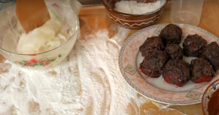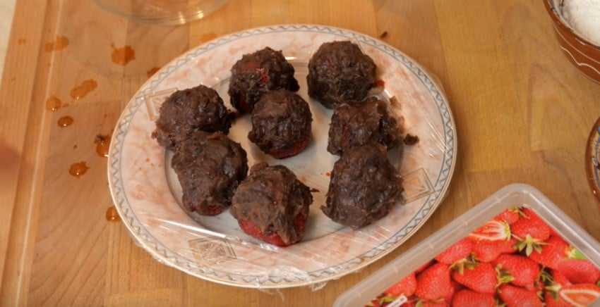 6. Клубнику промойте, обсушите и срежьте листики. Каждую ягоду полностью заверните в фасолевую пасту, сформируйте шарики.