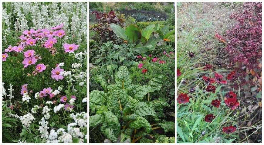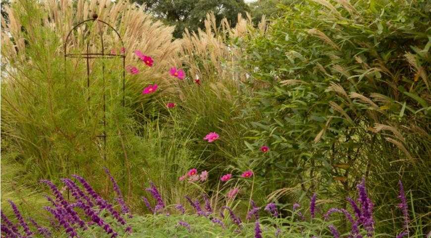 В окружении злаков, сальвии, мискантуса и пеннисетума космеи очень органичны