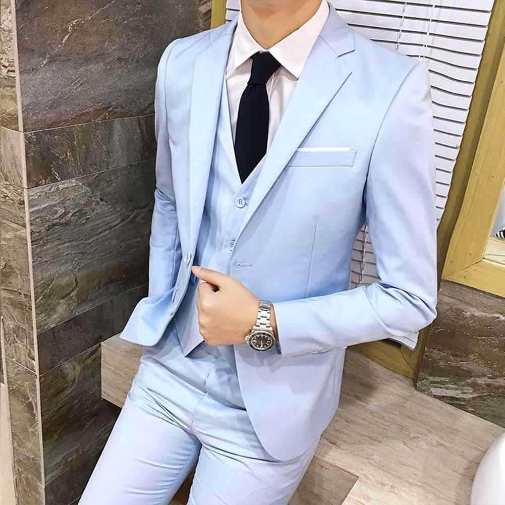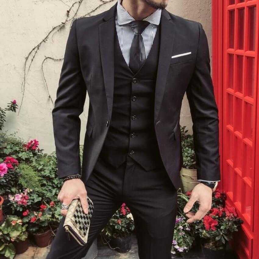Такие костюмы хорошо смотрятся не только на стройных мужчинах, за счет наличия жилета, они гармонично выглядят и на представителях мужского пола с лишними килограммами. Такой комплект зрительно вытягивает фигуру. К тому же после свадебного торжества, его вполне можно использовать для деловых встреч.