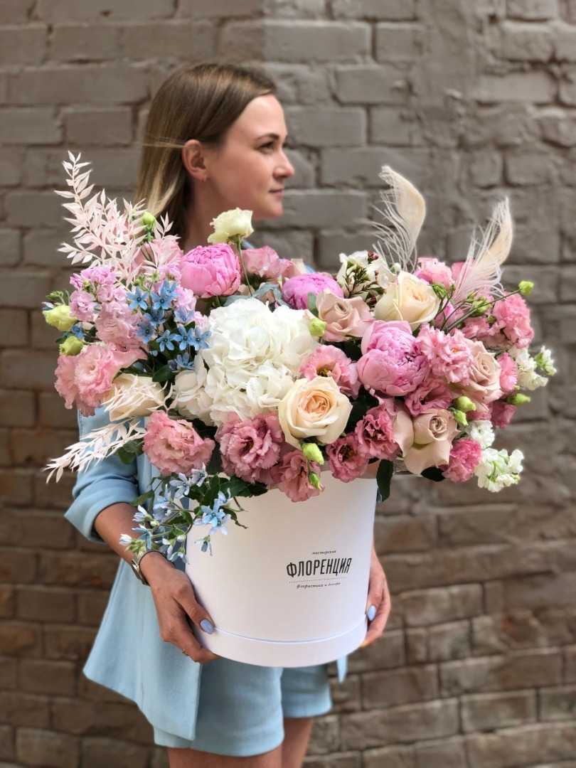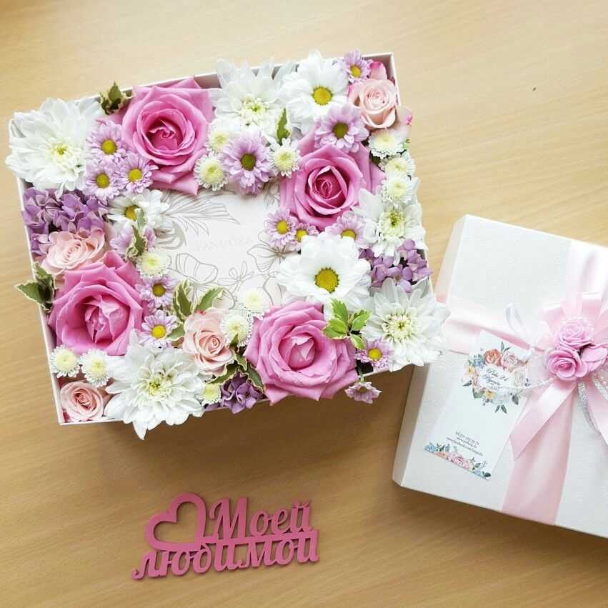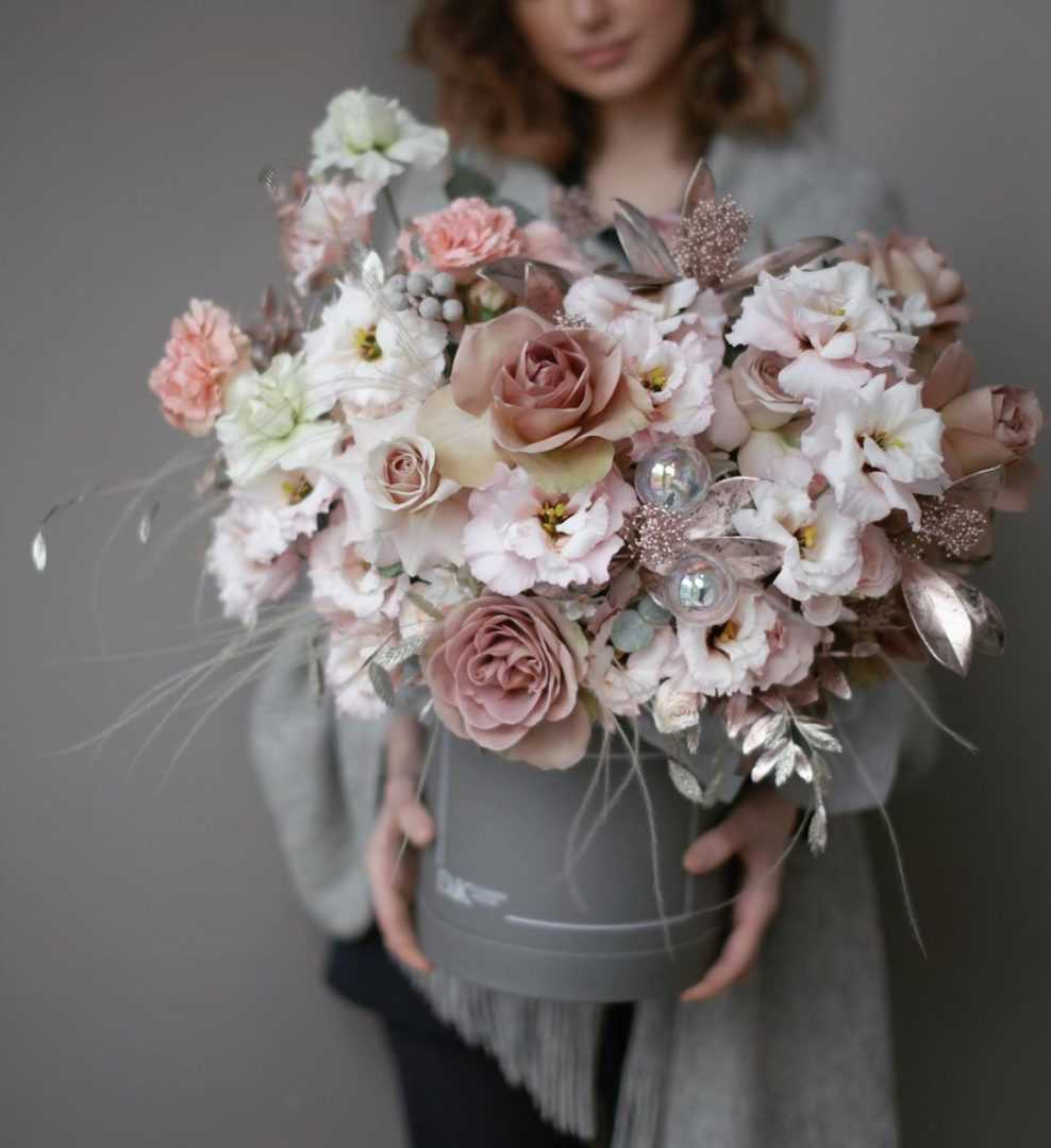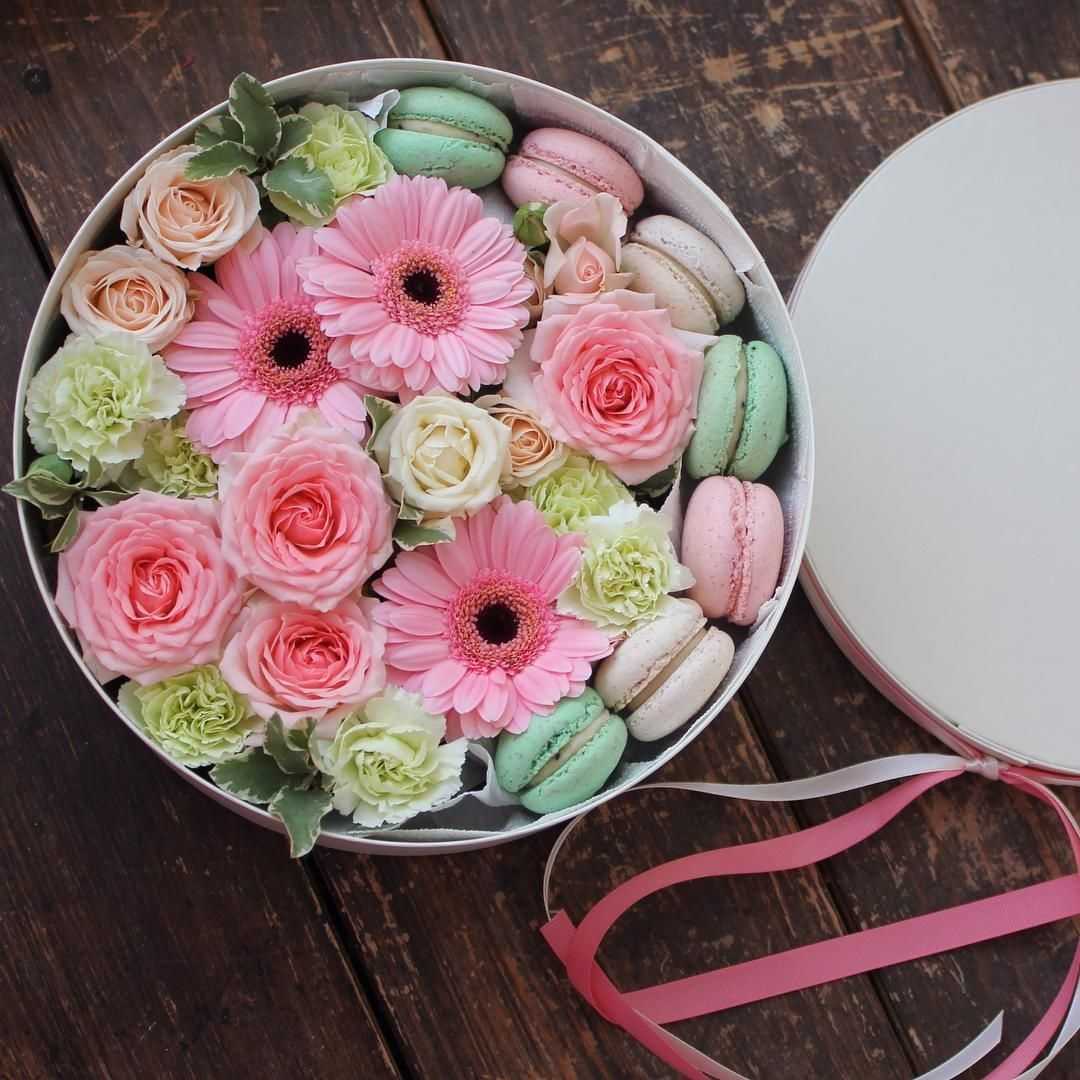 При составлении таких композиций нужно учитывать все тренды современной флористики. Рекомендуется отказаться от пластиковых и полимерных упаковок. Наиболее актуальными будут шляпные коробки. Наполнять их можно тюльпанами, орхидеями, розами, гортензиями и пионами. Чтобы добавить композиции оригинальности, можно добавить в нее ягоды, фрукты или макаруны. Для составления букетов в коробке допустимо использовать самые разные идеи декора. Кроме живых цветов можно использовать сухоцветы с хлопком. При составлении композиции самое главное – учитывать сочетаемость коробки, цветов и декора.