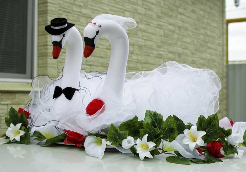 Наравне со свадебными куколками жениха и невесты часто можно встретить свадебные машины, украшенные фигурками лебедей.