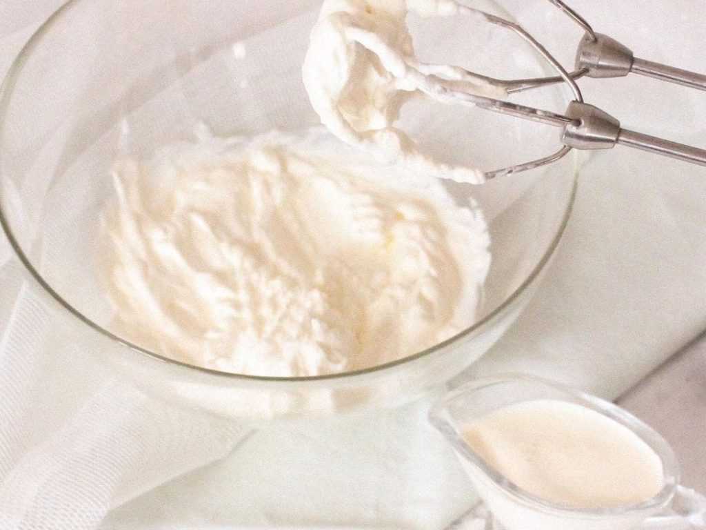 6. Как только масса станет достаточно густой, добавьте в нее ванилин и продолжайте взбивать состав. Мешайте его до состояния, когда смесь не начнет приставать к венчику и не будет спадать при наклоне посуды.