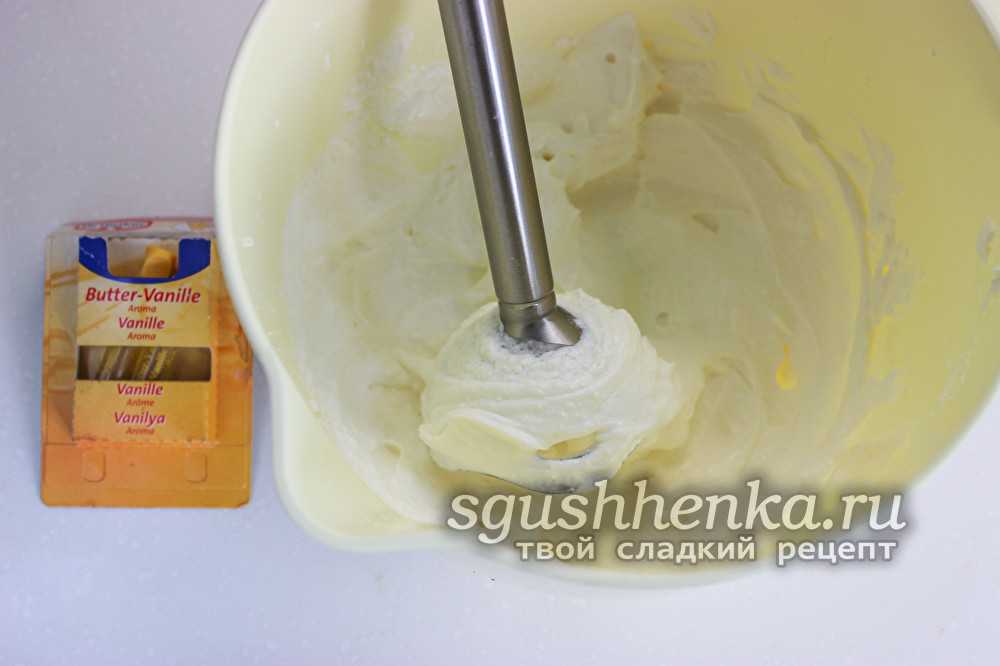 - Для крема следует взбить жирные сливки с добавлением пудры, вмешать в массу небольшими порциями сыр.