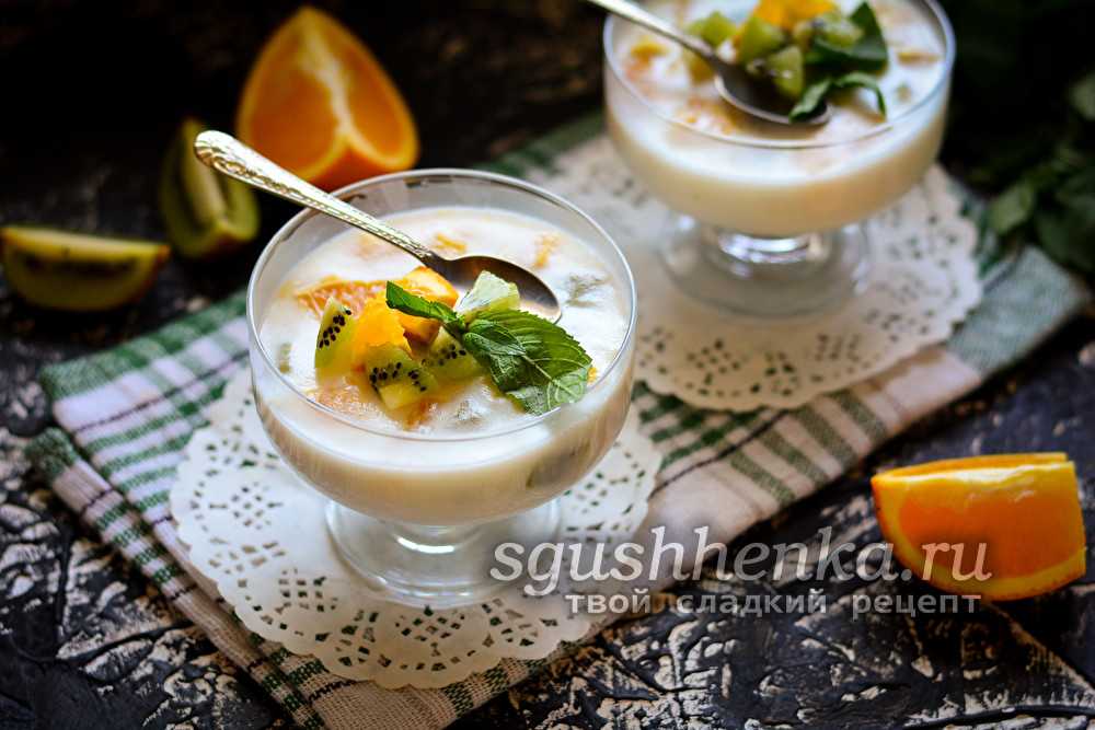 Достать готовый продукт и украсить по желанию – остатками нарезанных фруктов, ягодами, листиками мяты или тертым темным шоколадом.