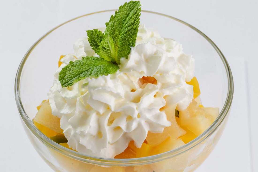 Десерт со взбитыми сливками и грушей