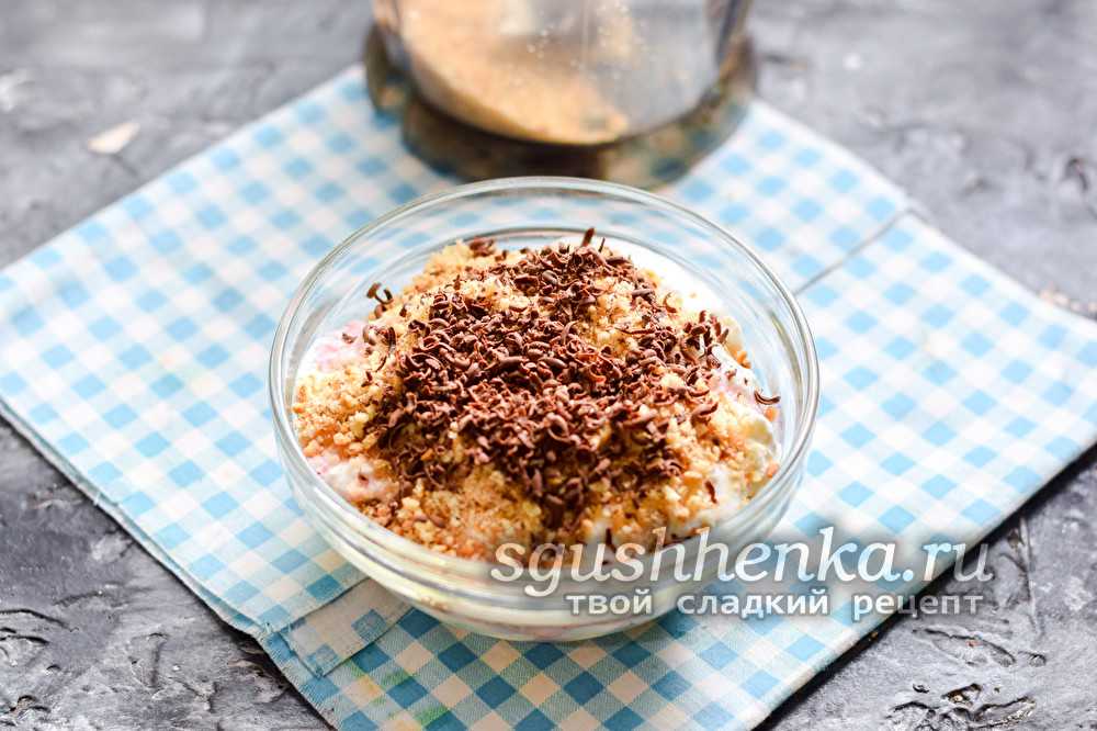 Последний верхний слой окрасить натертым на мелкой терке темным шоколадом или теми же орехами.