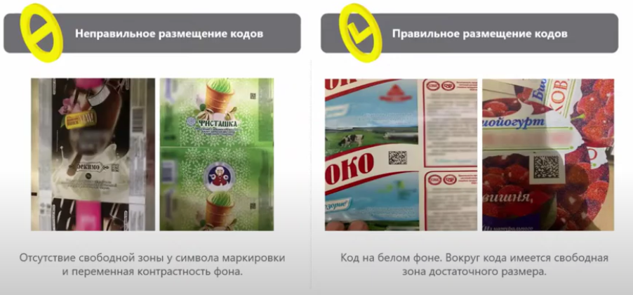 Основное правило — код маркировки должен хорошо считываться с упаковки. Для этого под ним должно быть предусмотрено белое поле. Оператор маркировки подчеркивает, что сохраняется запрет на нанесение кодов на прозрачную упаковку без белой подложки. Кроме того, ЦРПТ рекомендует оставлять вокруг кода так называемую “зону успокоения” — белое поле размером 2 мм, чтобы сканер мог четко отличить Data Matrix от элемента дизайна на упаковке. Ниже приведен пример правильного и неправильного размещения кодов.