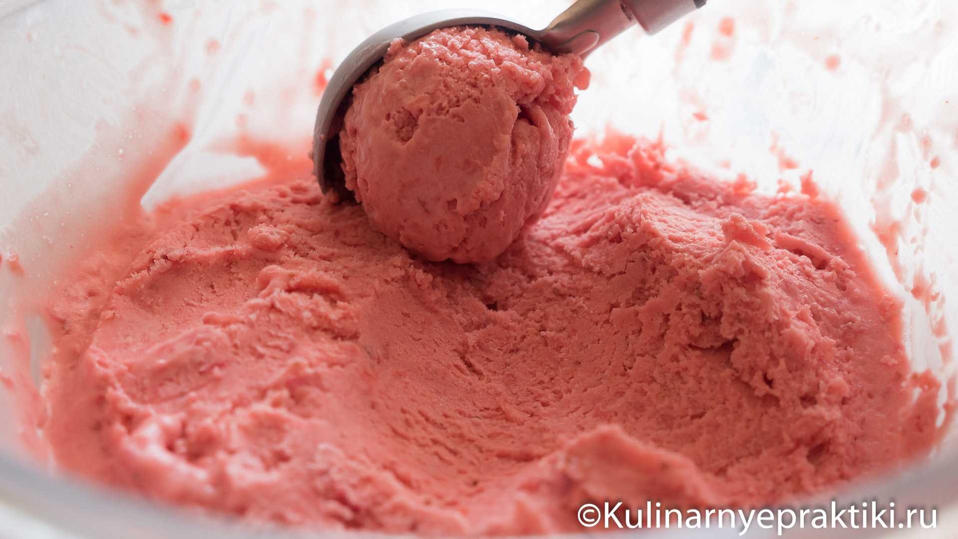 В процессе заморозки несколько раз загляните в контейнер и перемешайте его содержимое ложкой. Тем самым мы предотвратим образование льдинок в мороженом.