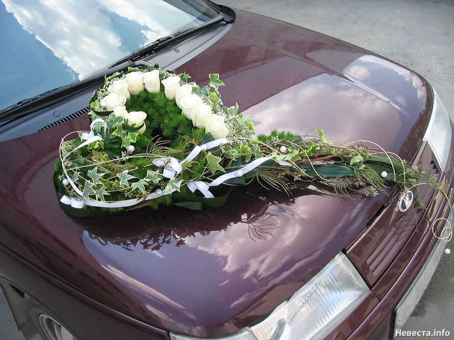 - одиночные цветочные элементы, закрепленные на атласных лентах капотов свадебных автомобилей;