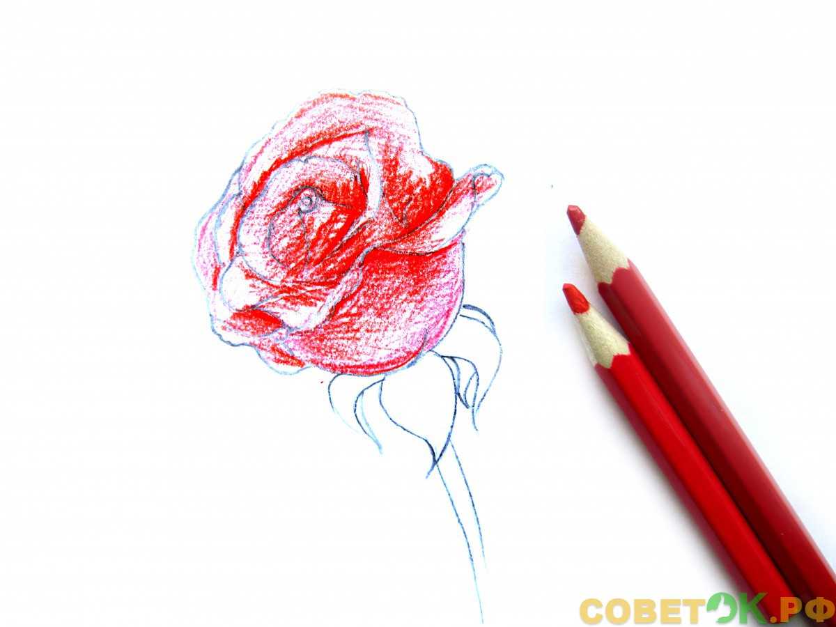 6. Раскрашивать розу начинаем с бутона, которому необходимо нанести базовый цвет. Это будут карандаши красных тонов. Их наносим вначале на всю поверхность цветка с одинаковым нажимом. Затем определяем теневые места и их затемняем более темным цветом.