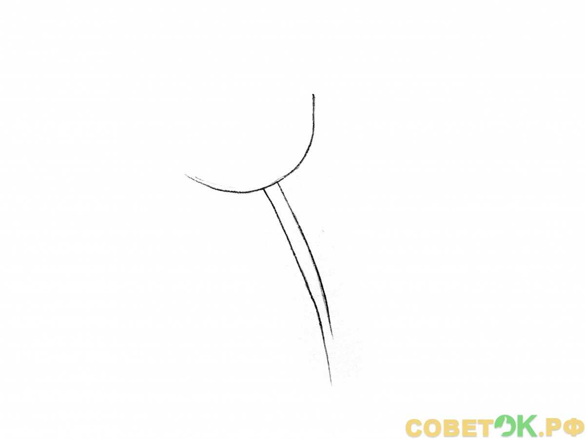 1. Рисуем основание розы в виде дуги, которая наклонена в левый бок. От центра простым карандашом проводим две параллельные линии, ведущие вниз. Это будет стебель цветка.