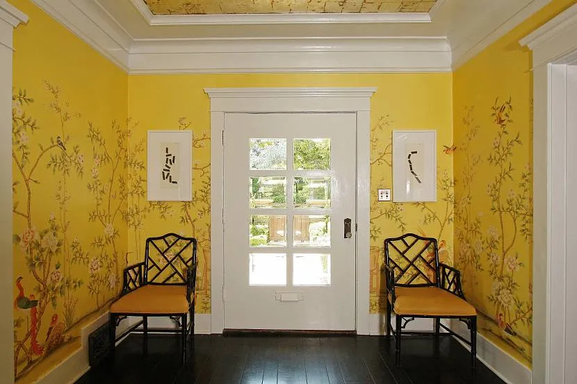 Желтая отделка стен в прихожей удачно сбалансирована белым цветомИсточник wp-tid.zillowstatic.com