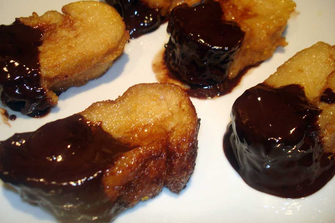 Вариант посложнее – апельсиново-шоколадные торрихас. Для приготовления сиропа нужно выжать 150 мл апельсинового сока и смешать его со 100 граммами сахара, нагреть на небольшом огне. Когда сахар растворится, добавить столовую ложку меда и помешивать до легкого загустения. Затем остудить и пропитать уже обжаренные торрихас. Шоколад растопить на водяной бане, окунуть в него половину гренки и дать застыть. Необычные торрихас с апельсином и шоколадом готовы!