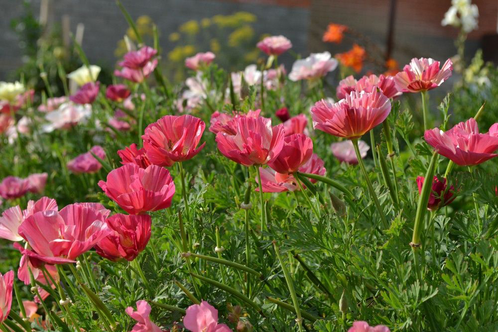 Средний план – кустики 50-100 см (основной ассортимент – цинния, эшшольция, шалфей, космея и другие), а дальний – 110-180 см (подсолнечник, клещевина).