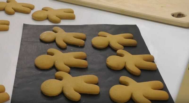 1. Из подготовленного теста вырезаю имбирных человечков специальной формочкой. Укладываю их на противень, застеленный пергаментом или тефлоновым ковриком, на небольшом расстояние друг от друга. Ставлю пряники в предварительно разогретую до 180 градусов духовку. Выпекаю около 10 минут, до готовности.